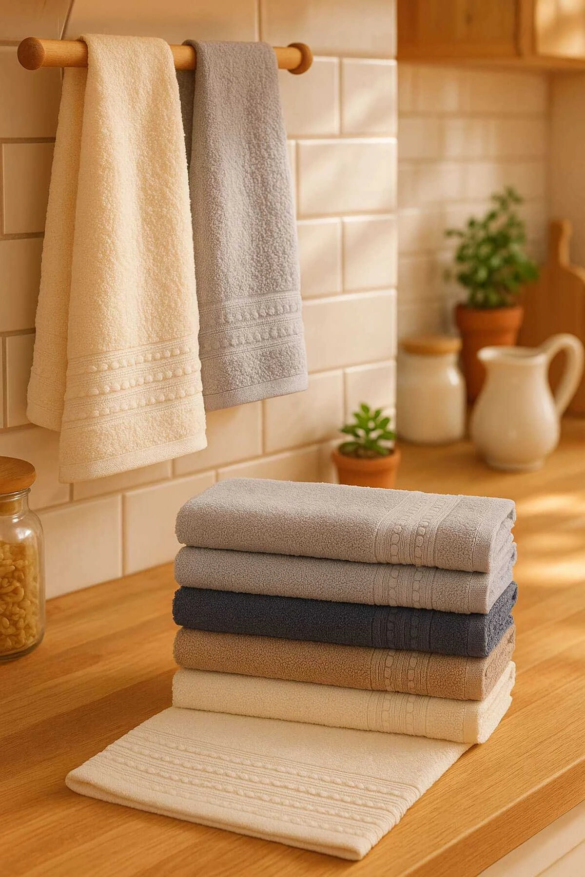 6’lı mutfak havlusu seti; 30x50 cm ölçülerindeki ideal boyutu, yumuşak dokusu ve yüksek emiciliği ile mutfağınızın vazgeçilmez yardımcısı olacak.