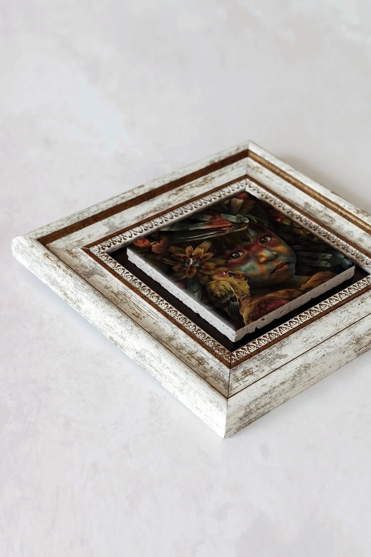 Ürün hakkında: Ölçüleri: 20 cm x 20 cm'dir. ; Kalınlık :2,5 cm'dir. ; Ürünün arka tarafında askı aparatı bulunmaktadır. ; Kullanılan çerçeveler yüksek kaliteli, eskitme görünümlü kompozit malzemeden üretilmiştir. ; Taşların yüzeyindeki baskı teknolojisi özel olup sağlığa hiçbir zararı yoktur. ; Kullanılan malzeme dağdan çıkan gerçek taş oldugu için yüzeyinde belli oranda gözenek bulunması ve renginin krem renginin tonlarını barındırması normaldir kimyasal malzeme teması Yüzey deformasyona maruz kalabilir. ; Nemli bezle silinerek temizlenebilir. ; Isıya, suya ve neme dayanıklıdır. ; Kutu içeriği: Orijinal kutu içerisinde 1 adet çerçeveli taş duvar dekoru. ; 1 adet çerçeveli duvar dekoru ağırlığı: 250 gr çerçeve askısı ile duvara montajı yapılabilir.;