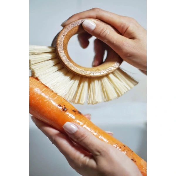 AHŞAP SEBZE MEYVE YIKAMA FIRÇASIÜrün ÖzellikleriAhşap sebze meyve yıkama fırçası, mutfağınızda doğal ve etkili temizlik sağlar. Sert bitkisel fırça kılları sayesinde havuç, patates, pancar, turp gibi kabuğuyla tüketilebilen sebzelerin yüzeyindeki toprak, kir ve kalıntılar nazikçe temizlenir. Parmak geçmeli halka tasarımı ergonomik bir tutuş sunarken, ahşap malzeme estetik ve doğa dostu bir kullanım deneyimi sağlar. Kimyasal kullanmadan temizlik yapmak isteyenler için ideal olan bu ürün, sürdürülebilir yaşam tarzına uygun bir alternatiftir. Plastik içermeyen yapısı ile çevre bilincine katkı sağlar. Özellikle sağlıklı beslenmeye ve doğal hijyene önem veren kullanıcılar için mükemmel bir mutfak yardımcıdır.Paket İçeriği1 Adet Ahşap Sebze Meyve Yıkama Fırçası