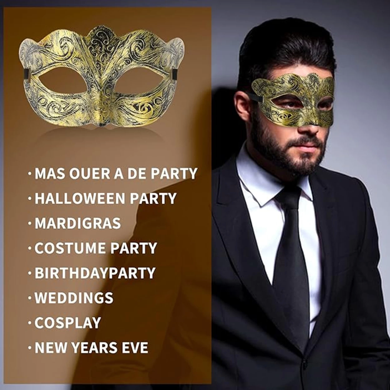 ???? Özel etkinliklerde fark yaratın ve gizemli bir hava katın! Altın renkli eskitme detaylarıyla tasarlanan bu maske, hem şık hem de göz alıcı bir görünüm sunar.