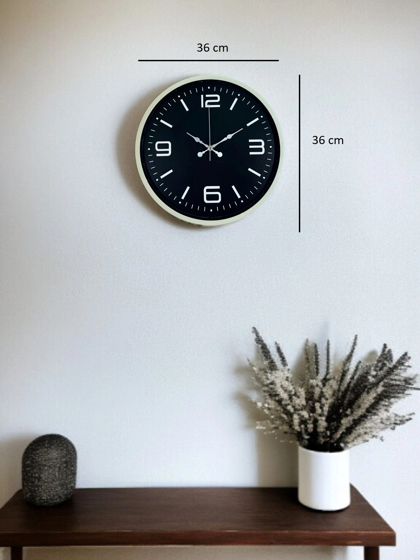 Krem renkli çerçevesi ve siyah zemin üzerindeki beyaz rakamlarıyla tasarlanan bu 36 cm duvar saati, yüksek kontrastlı kadranı sayesinde zamanı tek bakışta kolayca okumayı sağlar. Sade ve modern tasarımı, hem ev hem de ofis dekorasyonlarında uyumlu ve düzenli bir görünüm sunar. Minimal çizgileri sayesinde klasik ve çağdaş mekânlara rahatlıkla eşlik eder.