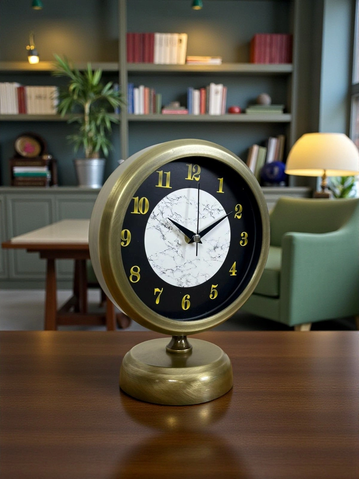 Klasik çizgileri modern detaylarla birleştiren bu eskitme gold masa saati, bulunduğu ortama sofistike bir hava katar. Siyah zemin üzerinde yer alan mermer desenli kadranı ve gold rakamlarıyla dikkat çeken tasarımı; salon, çalışma odası, ofis, konsol üstü ve vitrinler için kusursuz bir tamamlayıcıdır. 25 x 20 cm ölçüsü sayesinde hem yer kaplamaz hem de dekorasyonda güçlü bir duruş sergiler.