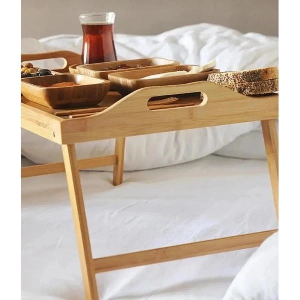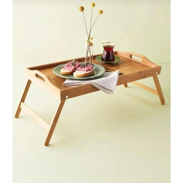 BAMBU KULPLU AYAKLI KEYİF TEPSİSİÜrün ÖzellikleriDoğal bambu malzemeden üretilen Bambu Kulplu Ayaklı Keyif Tepsisi, hem şık hem de işlevsel tasarımıyla evinizin her köşesinde pratik bir kullanım sunar. 63 cm uzunluğunda, 30 cm genişliğinde ve 25 cm yüksekliğindeki boyutlarıyla ideal bir servis alanı sağlar. Katlanabilir ayaklı yapısı sayesinde hem yatakta kahvaltı tepsisi olarak kullanılabilir hem de dizüstü bilgisayar masası olarak tercih edilebilir.Kulplu tasarımı, tepsinin kolay taşınmasını sağlar ve yan kenarları sayesinde yiyecek veya içeceklerin düşmesini engeller. Bambu yüzeyi doğal bir dokuya sahiptir, çevre dostu yapısıyla uzun ömürlü kullanım imkânı sunar. Hafif ve dayanıklı yapısı sayesinde taşınması kolaydır. Katlandığında az yer kaplar, böylece dolap veya raflarda rahatlıkla muhafaza edilebilir.Bu tepsi; kahvaltı, çay saati, çalışma alanı veya dekoratif sehpa olarak çok amaçlı kullanım için uygundur. Estetik tasarımıyla yaşam alanlarına doğal bir zarafet katar.Paket İçeriği1 adet bambu kulplu ayaklı keyif tepsisi