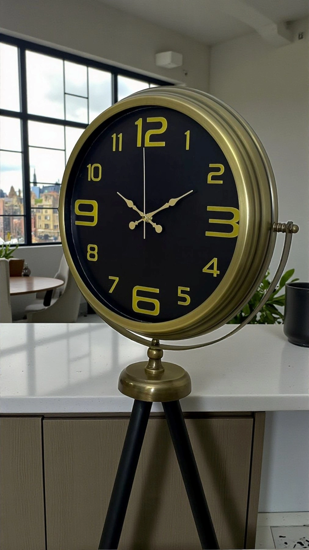 Tripod ayaklı yapısı sayesinde duvara montaj gerektirmeden kullanılır; taşıması ve konumlandırması pratiktir. Üst bölümdeki çerçeveli tasarım ve dengeli ayak yapısı hem görsel olarak “tasarım ürünü” hissi verir hem de zeminde sağlam duruş sağlar. Büyük kadran yapısı uzaktan kolay okunur; dekoratif rakam ve ibre tasarımıyla mekâna sofistike bir dokunuş ekler.