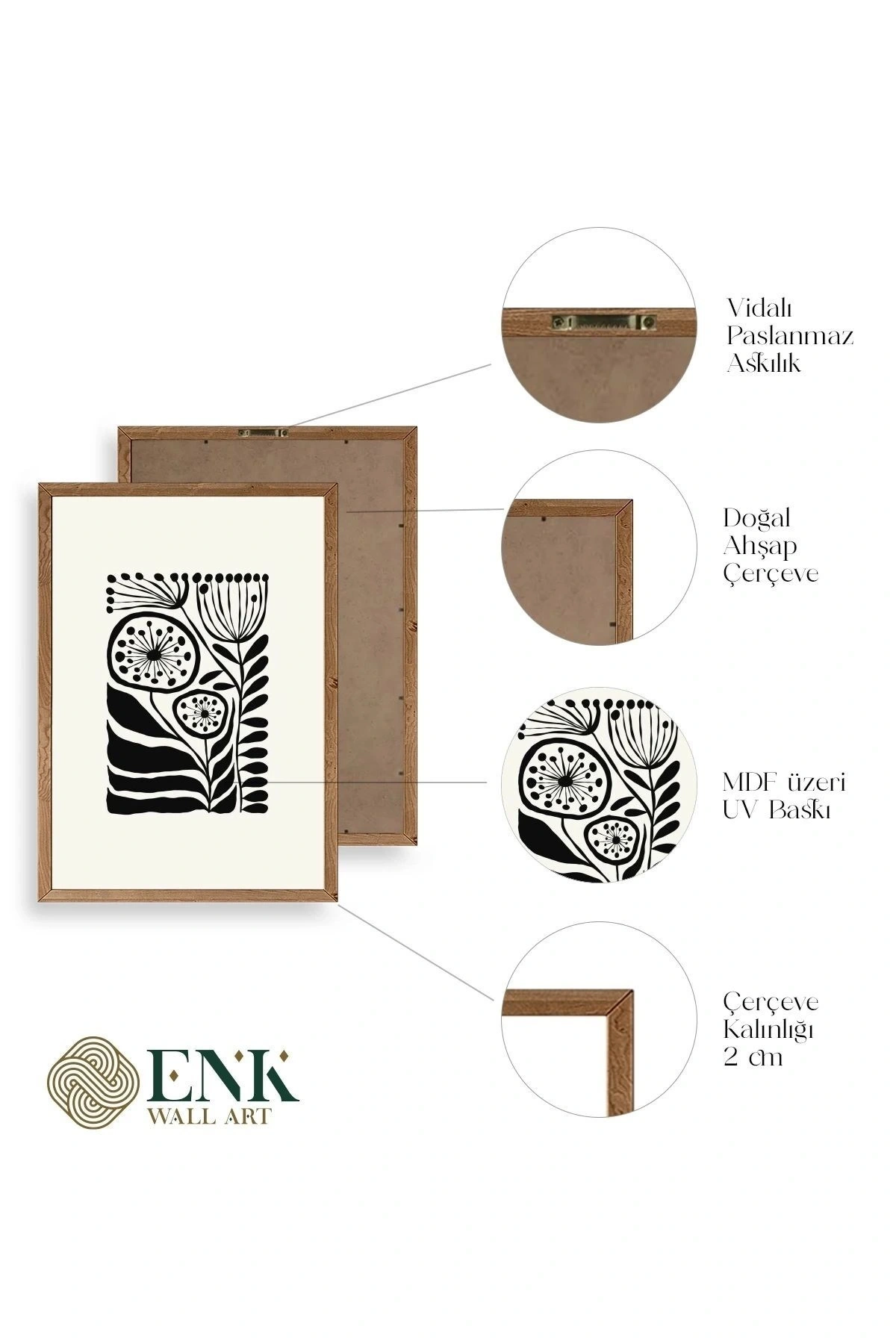 Tablolarımız gerçek ahşap çerçevelidir, çerçeve görünümlü değildir. ; ENK Wall Art Olarak Ahşap Çerçeveli Tablolar Üretiyoruz. ; Tablolarımız tek parça, 3 Parça, 5 Parça ve daha çok kategoride tasarımcılarımız tarafından ev ve ofisleriniz duvarları süslemek için tasarlanmaktadır. ; Ahşap Çerçeveli Duvar Tabloları ile yaşam alanlarınıza yepyeni bir görünüm kazandırın. ; Yıllarca dayanacağından emin olduğumuz sağlam çerçevelere sahip yüksek kaliteli ahşaptan üretilmiştir. ; İster bir köşeyi süslemek isteyin, ister evinizi yenilemek , bu ahşap tablolar herhangi bir yaşam alanına stil ve işlev getirecektir. ; Duvara kolay bir şekilde monte edilir. ; Uzun ömürlü kullanım için sağlam ahşap çerçeveden yapılmış, dayanıklı ve güçlü. ; Duvara monte edilebilir tasarımı, yaşam alanlarında veya yatak odalarında duvara kolayca asılmasını sağlar. ; Pürüzsüz üst yüzeyi temiz kalmayı kolaylaştırır. ; Herhangi bir stile uyacak şekilde çeşitli renklerde gelir. ; Kolay yeniden düzenleme için hafif ve portatif. ; Küçük oturma odaları veya dar alanlar için mükemmel boyut. ; Eve taşınma hediyesi olarak idealdir. ; Herhangi bir evin dekorunu süslemek için harika bir yol. ; Herhangi bir modern veya çağdaş iç tasarıma mükemmel bir katkı. ; Tablo içi 3 mm mdf (ahşap) malzeme üzeri uv baskıdır. ; Renkler canlı ve solma yapmaz. ; Kırılma, bükülme ve çizilmeye karşı dayanıklıdır.;
