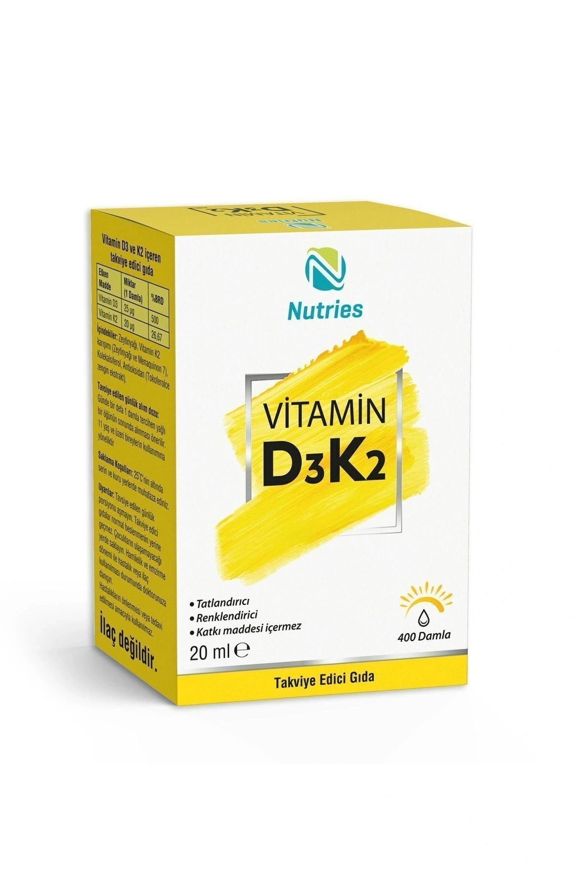 D3K2 Damla 20 ml – 1000 IU D3 + 20 mcg K2 – Sıvı Formda Kemik ve Damar DesteğiHer damlada 1000 IU D3 vitamini ve 20 mcg K2 vitamini içeren Nutries D3K2 Damla, kemik sağlığı ve kalsiyum dengesi için geliştirilmiş etkili bir sıvı takviyedir.D3 vitamini, kalsiyumun bağırsaklardan emilimini artırarak kemiklerin güçlenmesini destekler. K2 vitamini ise emilen kalsiyumun kemik ve diş dokusuna yönlendirilmesini sağlayarak damar sertleşmesini (kalsifikasyon) önler ve kardiyovasküler sağlığı korur.Bu iki vitaminin sinerjik etkisi, özellikle kemik erimesi riski olan bireyler için hayati önem taşır.Magnezyum ile birlikte kullanımı, bu takviyenin etkinliğini artırır. Magnezyum, D3 vitamininin aktif forma dönüşümünü destekler ve kalsiyumun hücreler tarafından verimli bir şekilde kullanılmasını sağlar. Böylece, kalsiyum metabolizması optimize edilir, kemik yoğunluğu artırılır ve mineral dengesi korunur.Sıvı damla formu, hem çocuklar hem yetişkinler için kolay kullanım sunar ve yüksek emilim sağlar.Nutries D3K2 Damla, günlük kemik desteğini pratik ve etkili bir şekilde almak isteyen herkes için ideal bir tercihtir.