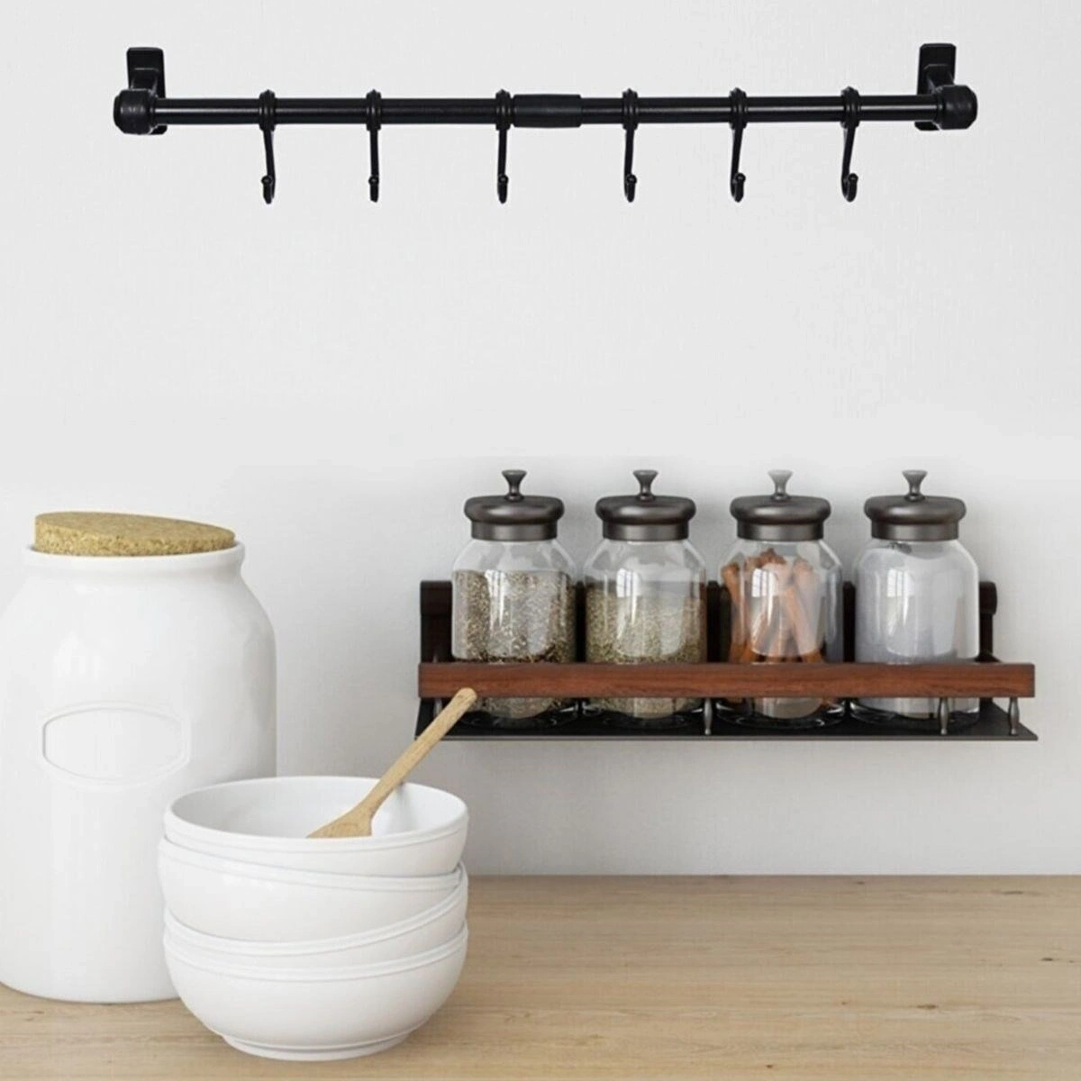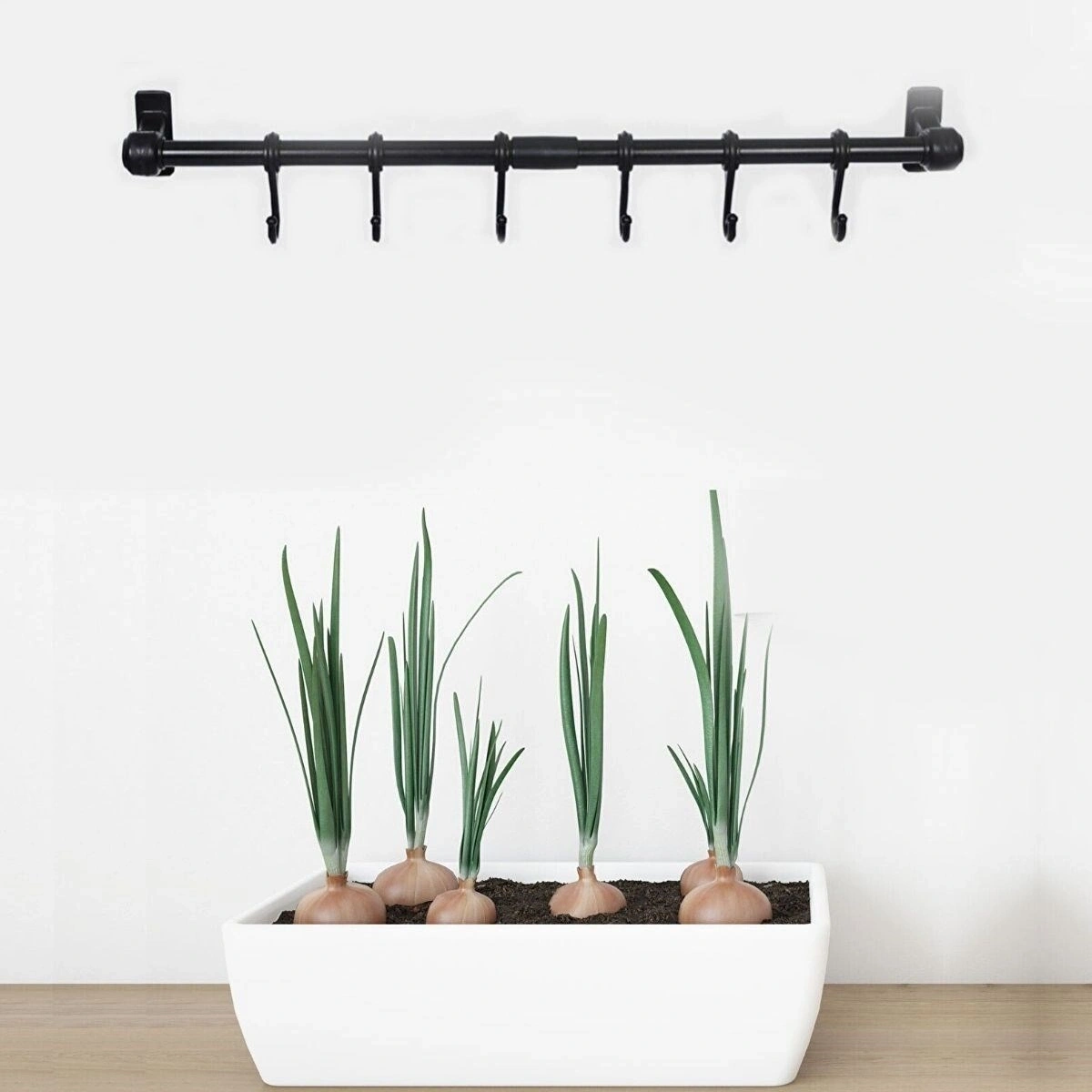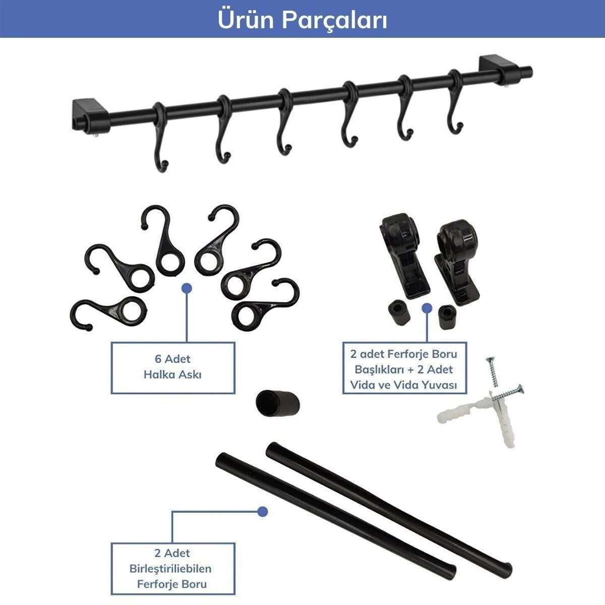 Siyah askı ve 6 adet kanca setinden oluşan bu ürün, hem mutfağınızda çok şık duracak hem de sürekli kullanabileceğiniz bir ürün olacakPratik bir şekilde her daim elinizin altında ve gözünüzün önünde olacak bu ürün mutfağınızın şıklığına şıklık katacak 6 kancadan oluşan ve duvara monte edilebilen ürüne servis kaşıklarınızı, kupalarınızı, muglarınızı, kahve ve çay fincanlarınızı , mutfak havlularınızı, mutfak bezlerinizi asabilirsiniz
