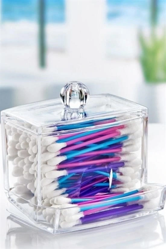 -Şeffaf üstten kapaklı şık tasarım, Altta kulak temizleme çubuklarının alınma bölmesi vardır