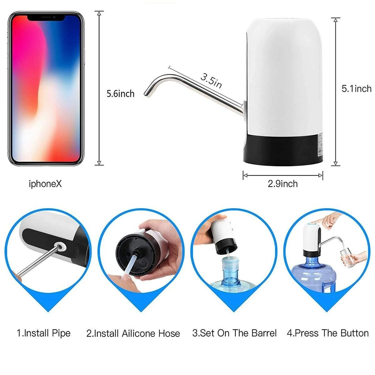 Şarj edilebilen otomatik damacana pompası, birinci sınıf ABS plastik kabuk, gıda sınıfı silikon tüp ve 304 paslanmaz çelik borusundan yapılmıştır