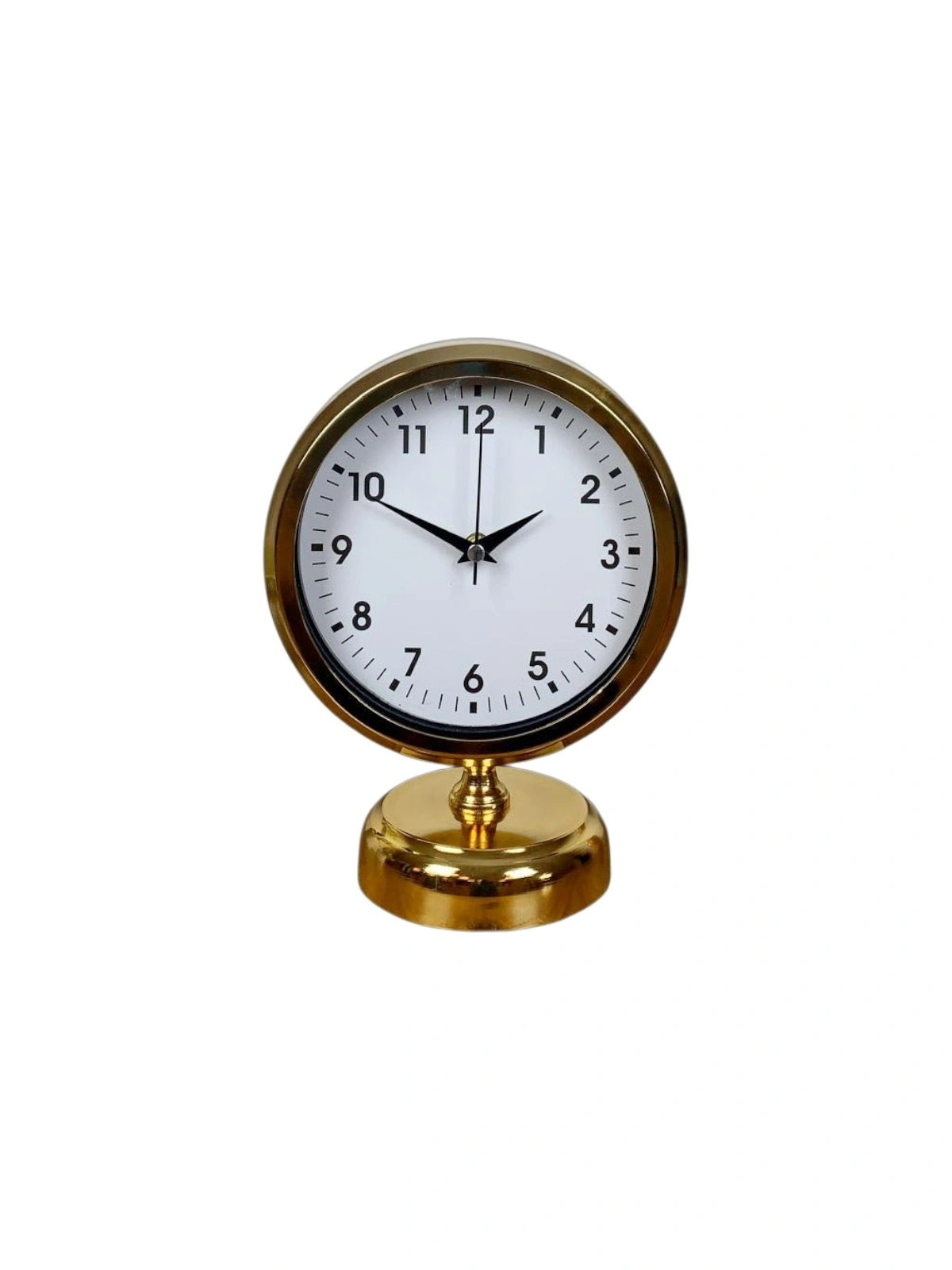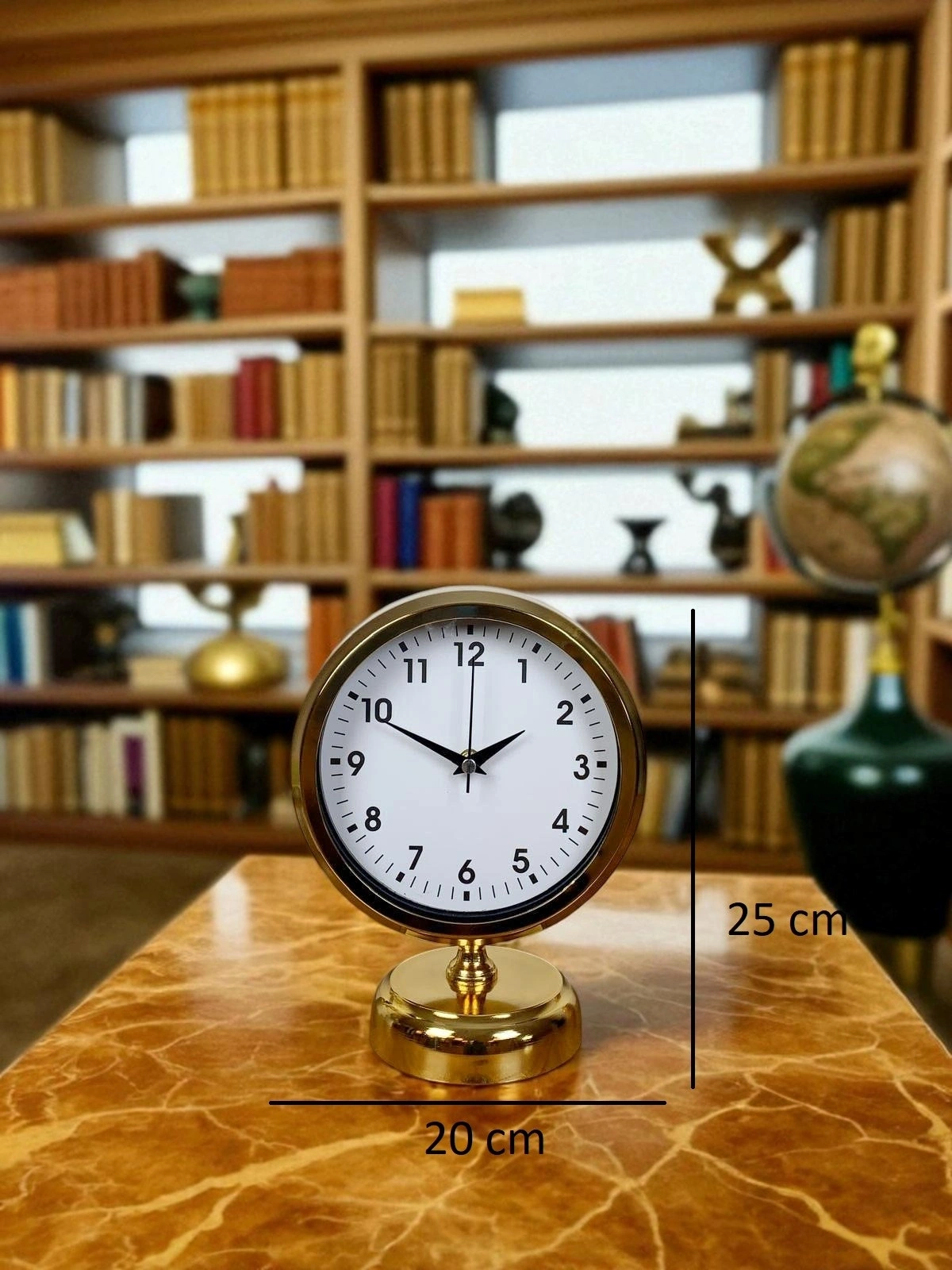Sağlam ve dengeli metal tabanı sayesinde masa üzerinde güvenle durur. Gold gövdenin parlak yüzeyi, ışığı zarif bir şekilde yansıtarak ürünü sadece bir saat değil, aynı zamanda dekoratif bir aksesuar haline getirir. Zamansız tasarımı sayesinde modası geçmeden uzun yıllar kullanılabilecek, şık ve kullanışlı bir masa saatidir.