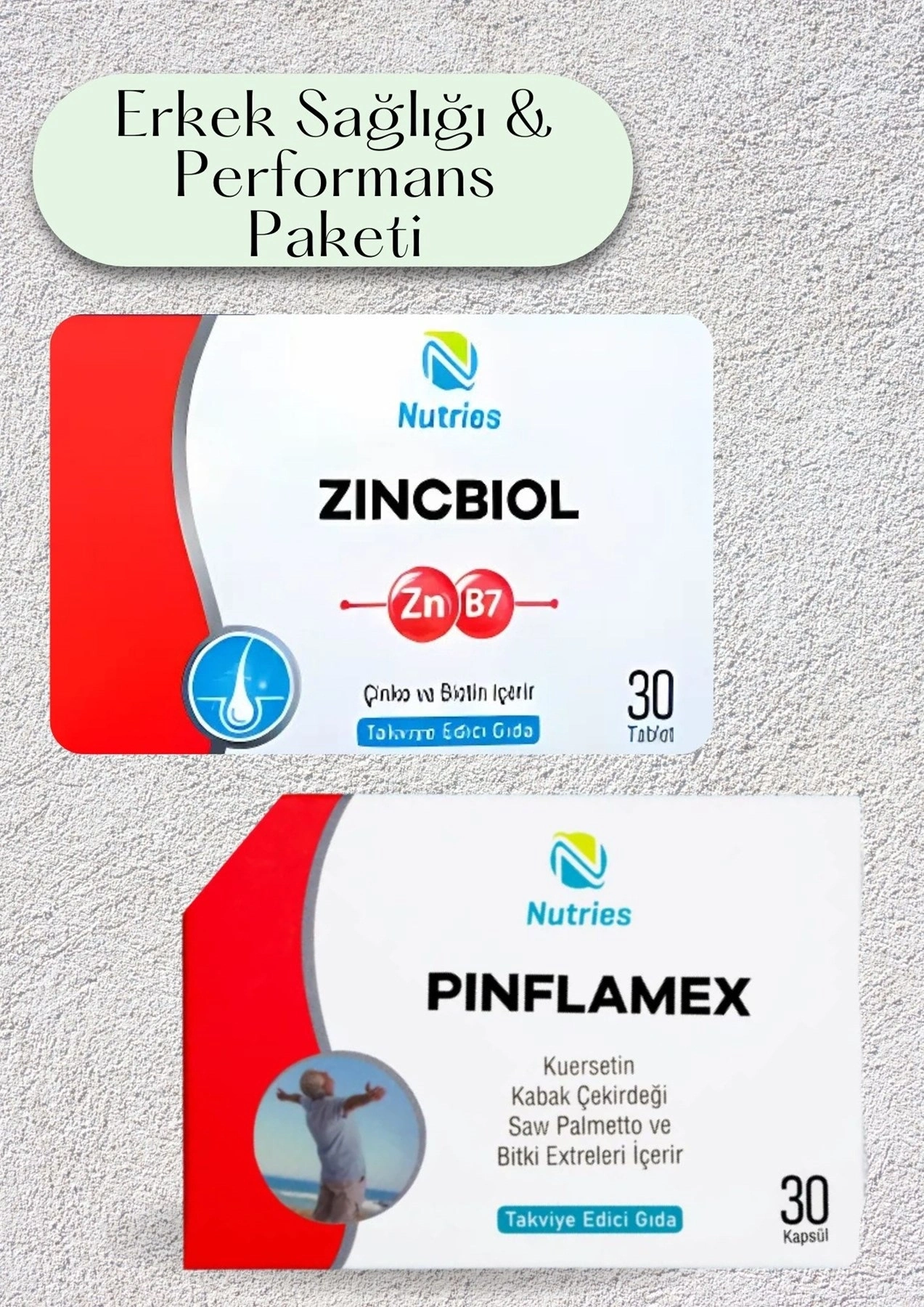 Nutries Pinflamex ve Zincbiol içeren bu özel kombinasyon, erkek sağlığını ve genel enerjiyi desteklemek üzere formüle edilmiştir. Prostat sağlığını korumaya yardımcı bitkisel ekstreler ve çinko içeriğiyle hormon dengesini destekler, bağışıklığı güçlendirir. Günlük yaşamda zindelik, güç ve performans arayan erkekler için ideal bir takviye paketidir.