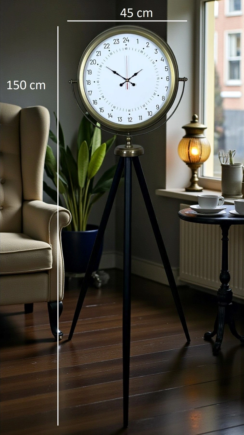 Tripod ayaklı özel tasarımı sayesinde bu model yalnızca bir saat değil, aynı zamanda dekoratif bir yer objesi olarak da öne çıkar. Yüksekliği ve dengeli ayak yapısı sayesinde salon, ofis, lobi, otel, kafe ve restoran gibi geniş alanlarda dikkat çekici bir odak noktası oluşturur.