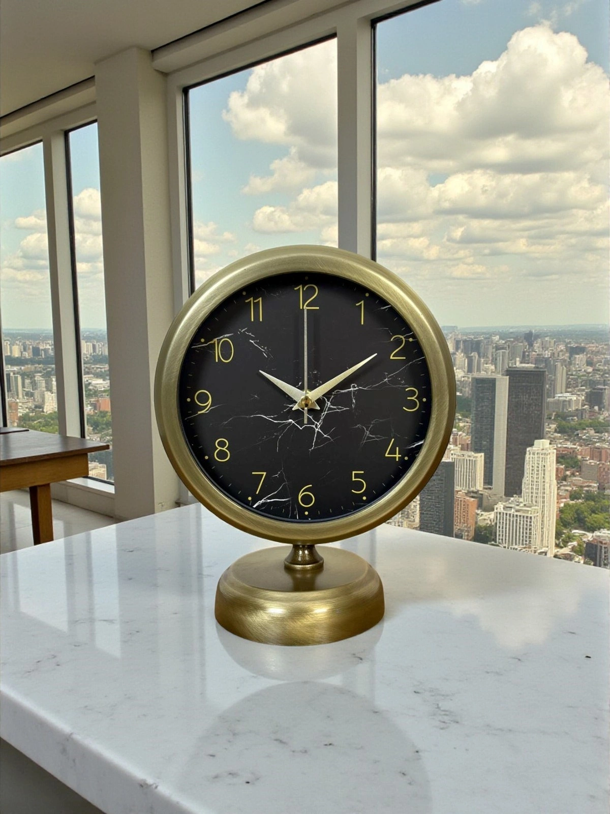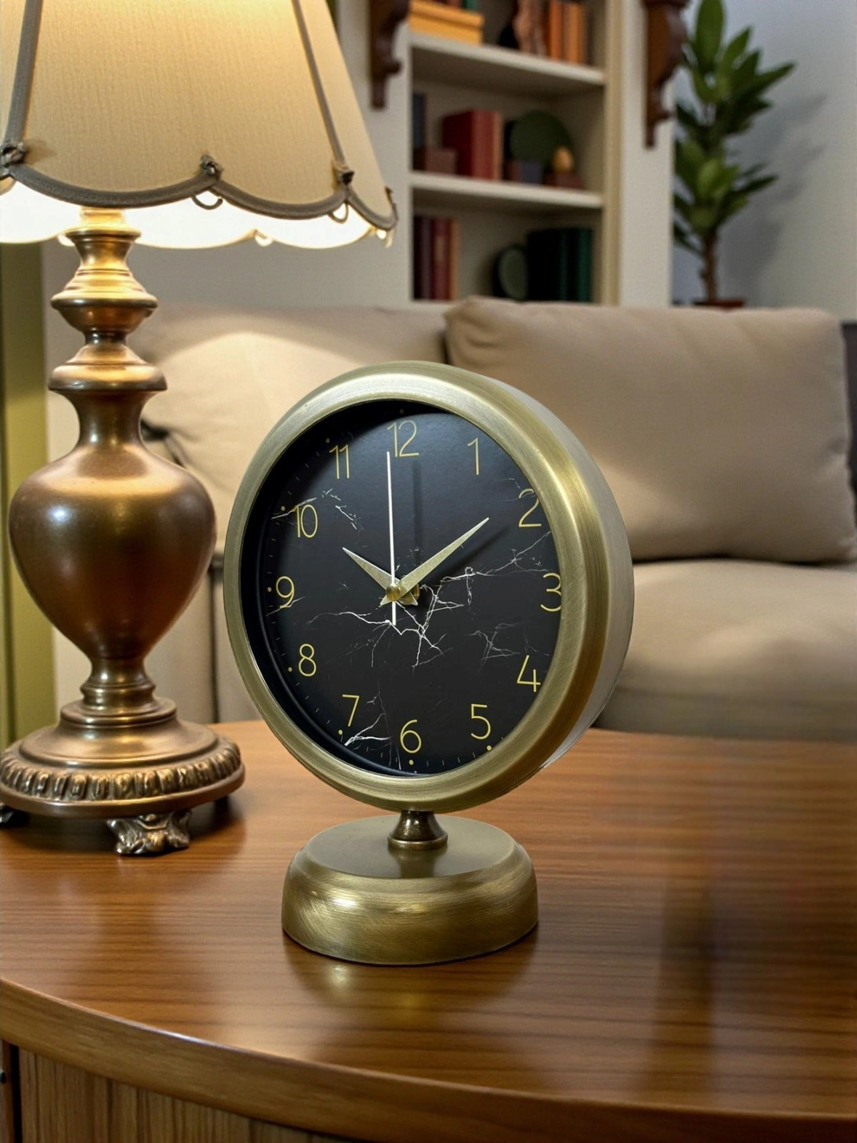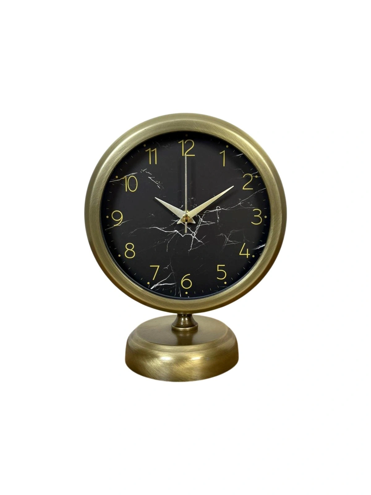 Şıklığı ve zarafeti bir arada sunan bu eskitme masa saati, modern mermer desenli kadranı ile klasik vintage tasarımı kusursuz şekilde birleştirir. Siyah zemin üzerine uygulanan mermer görünümlü desenler, saate sofistike ve premium bir karakter kazandırırken; gold tonlu rakamlar ve akrep-yelkovanlar ürünü estetik açıdan güçlü bir dekoratif obje haline getirir.