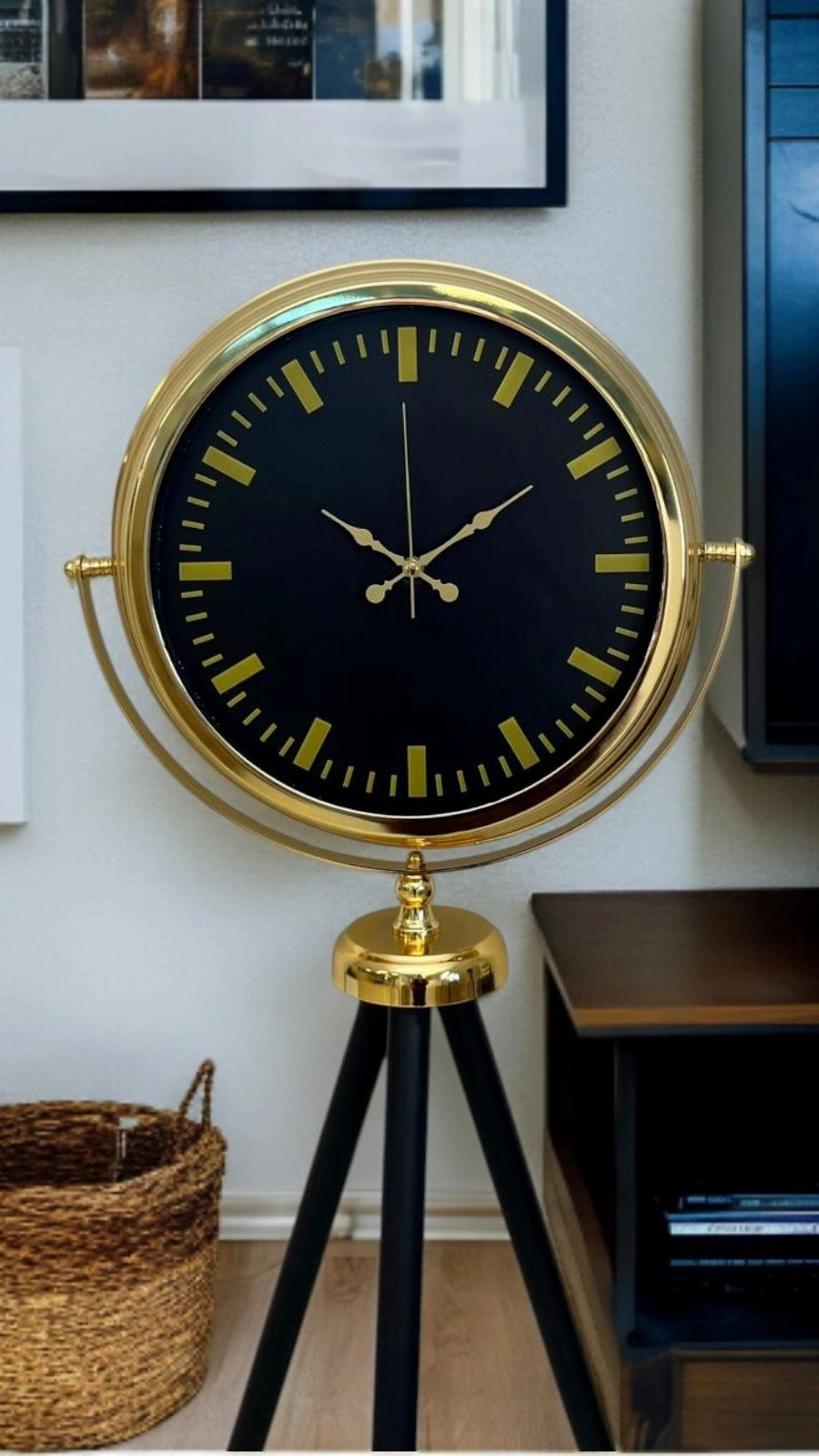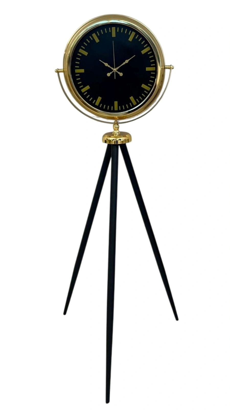 Modern tasarımı zamansız şıklıkla buluşturan bu gold tripod ayaklı yer saati, güçlü duruşu ve dengeli oranlarıyla bulunduğu mekânda hemen fark edilir. Siyah kadranın asaleti, gold metal çerçeve ve detaylarla kusursuz bir uyum yakalayarak hem modern hem de klasik dekorasyon stillerine rahatlıkla eşlik eder. Ev, ofis, showroom, otel lobisi veya prestijli yaşam alanları için dekoratif olduğu kadar fonksiyonel bir tamamlayıcıdır.