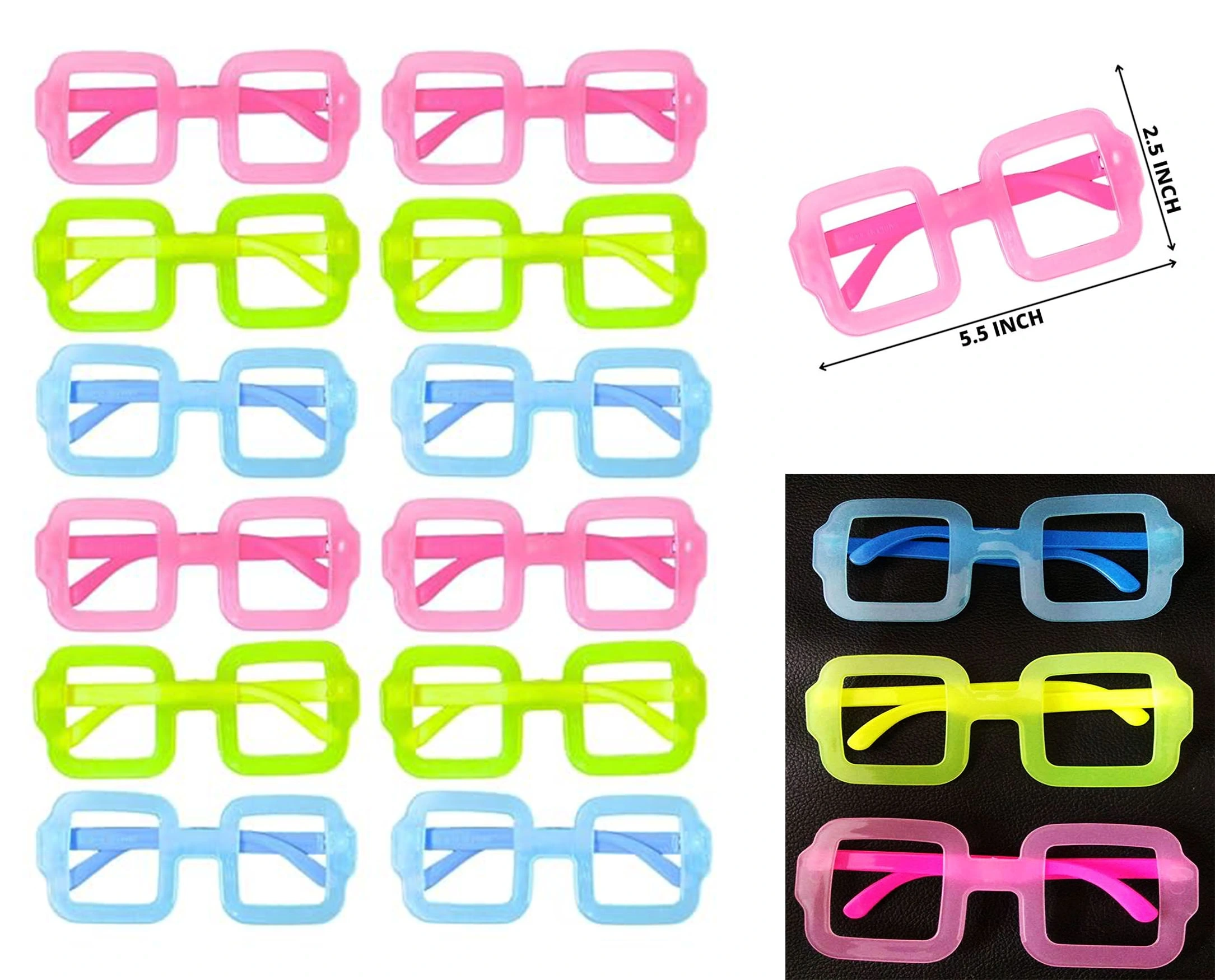 Fosforlu Kare Model Glow Parti Gözlüğü Karanlıkta Yanan Gözlükler 12 Adet (5365)