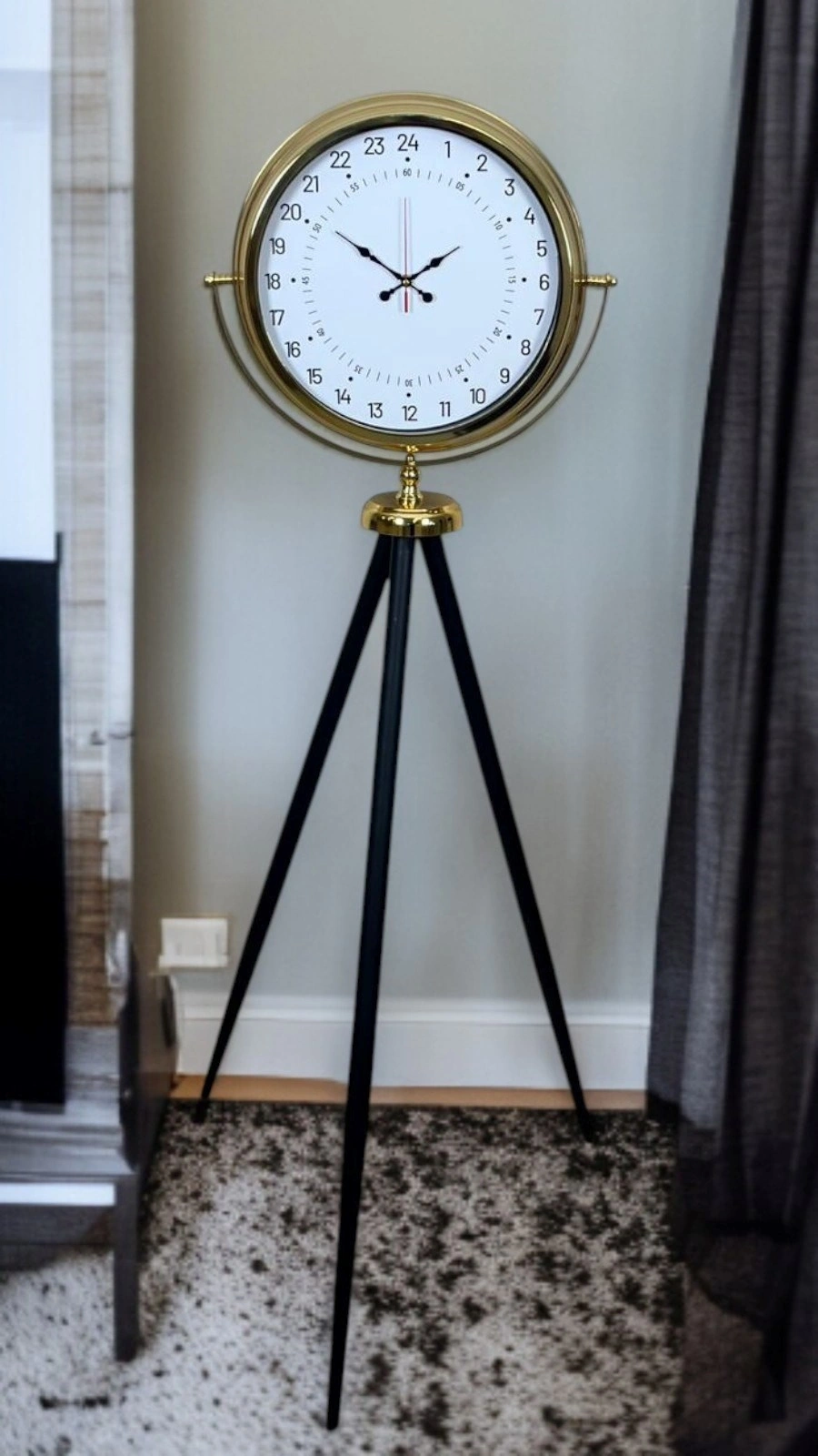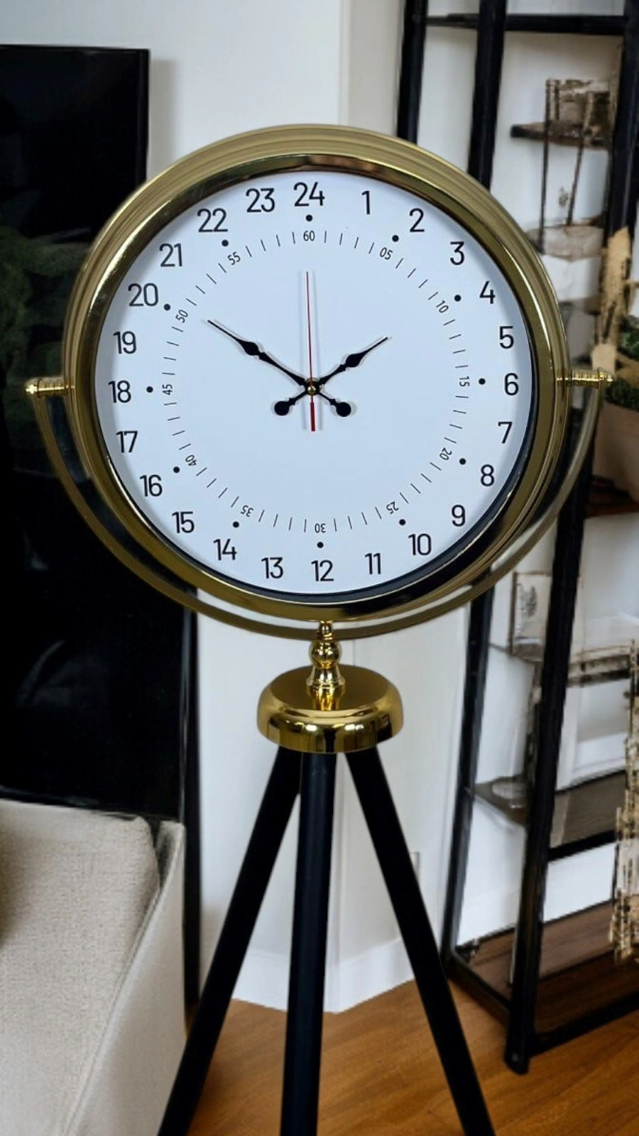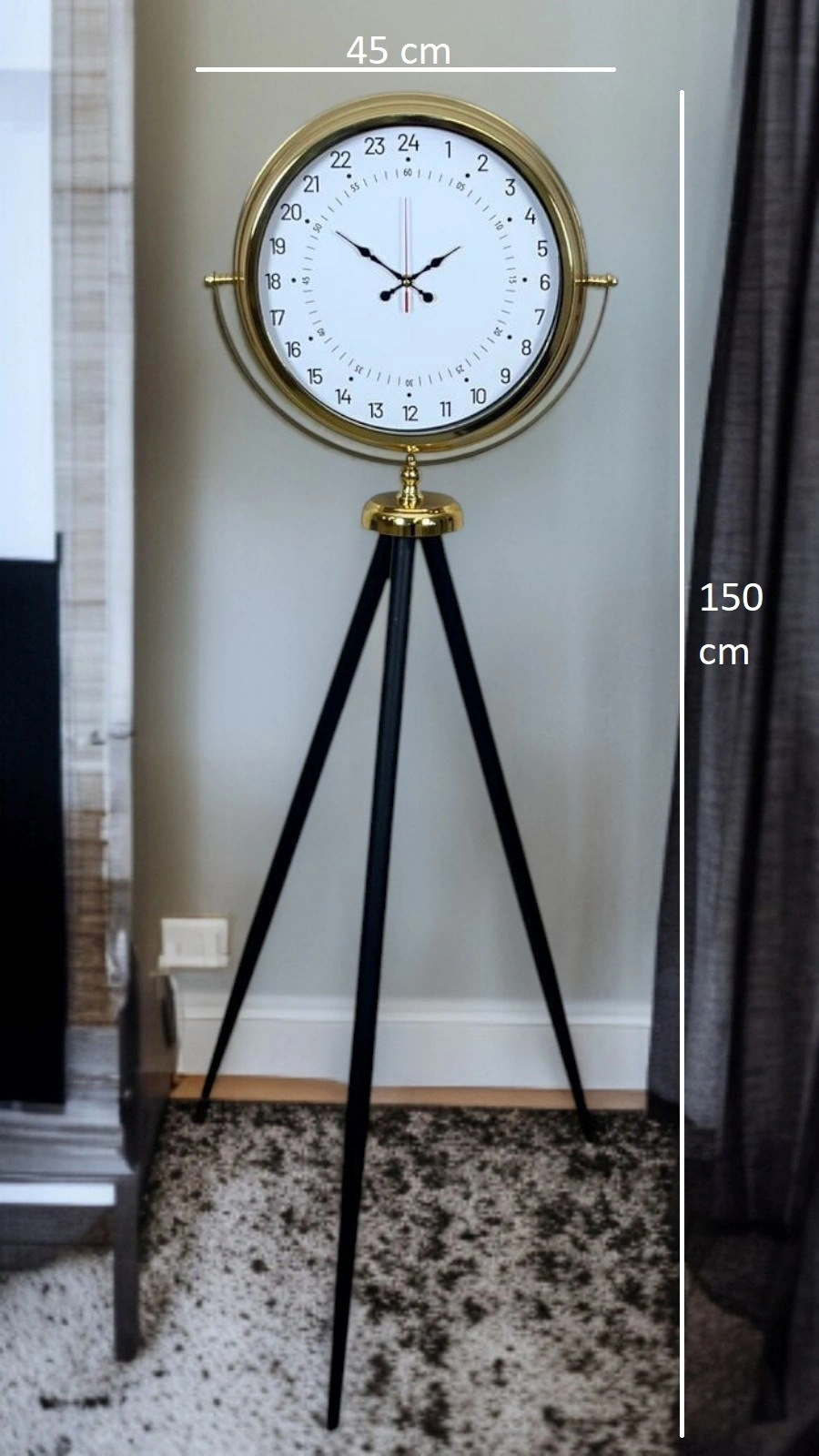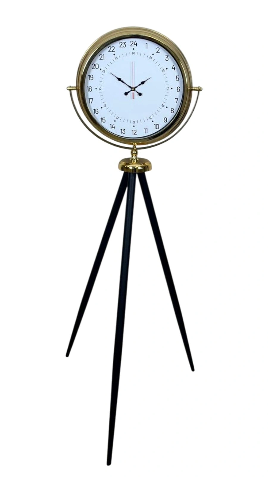 Bu gold tripod ayaklı yer saati, klasik saat anlayışının dışına çıkan 24 saatlik özel kadran tasarımı ile dikkat çeker. Standart saatlerin aksine zamanı yalnızca 12 saatlik döngüyle değil, günün tamamını tek bakışta okumanıza imkân veren 24 saat göstergesiyle sunar. Bu özelliği sayesinde sadece dekoratif değil, aynı zamanda fark yaratan fonksiyonel bir tasarım ortaya koyar.