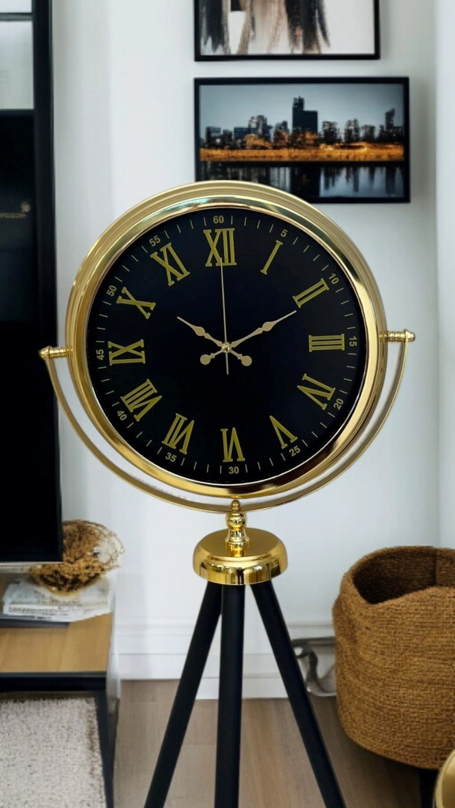 Metal gövdesinin gold kaplaması, siyah kadranla şık bir kontrast yaratırken; Roma rakamlar saate klasik ve asil bir karakter kazandırır. Tripod ayak yapısı hem estetik hem de sağlam bir duruş sağlar. Ürün, sadece bir saat değil aynı zamanda mekânın havasını yükselten dekoratif bir obje olarak tasarlanmıştır.
