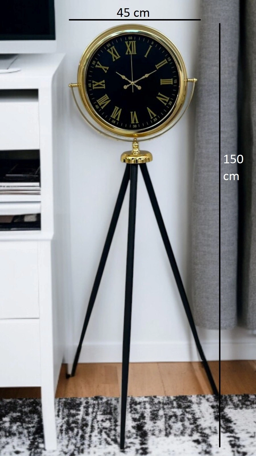 Gold çerçevesi, siyah kadranı ve klasik Roma rakamlarıyla öne çıkan bu tripod ayaklı dekoratif saat, zamansız tasarımı modern detaylarla buluşturur. Yüksekliği ve dengeli formu sayesinde bulunduğu mekânda güçlü bir odak noktası oluşturur. Salonlardan ofislere, otel lobilerinden prestijli yaşam alanlarına kadar geniş bir kullanım alanı sunar.