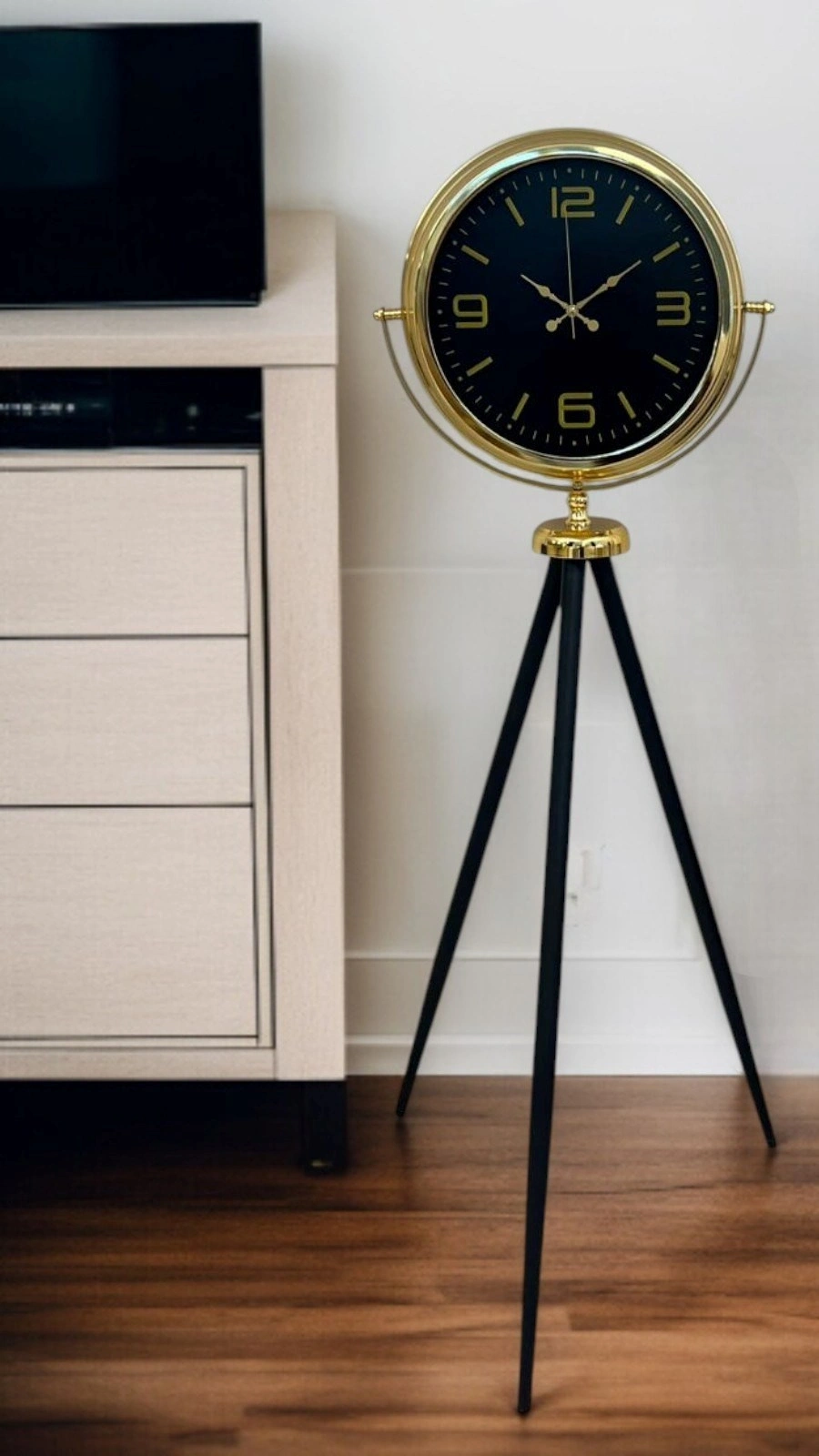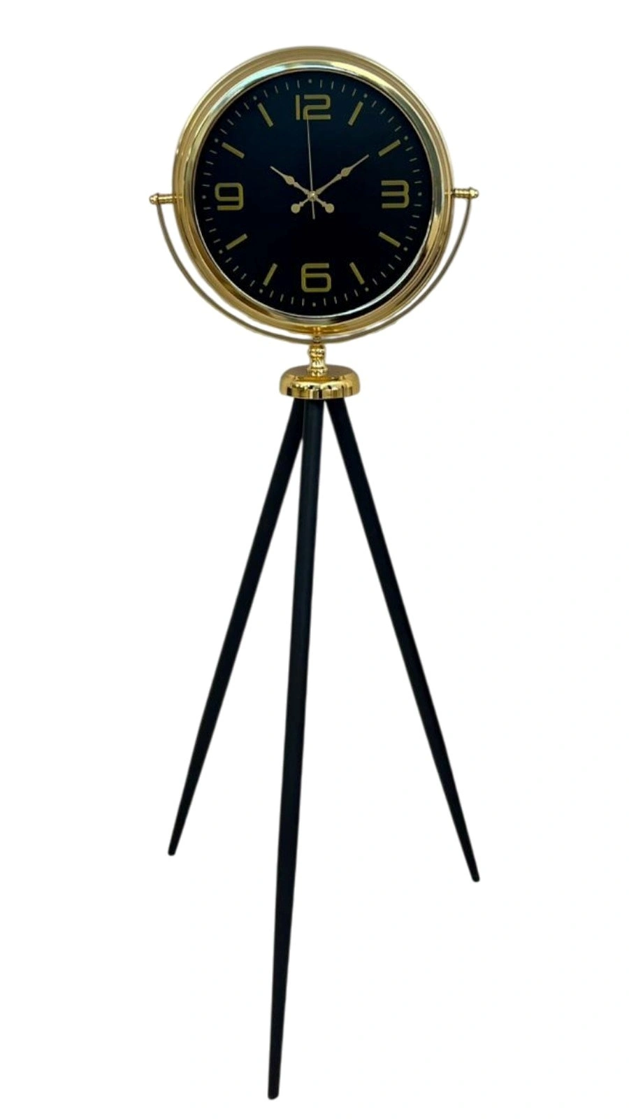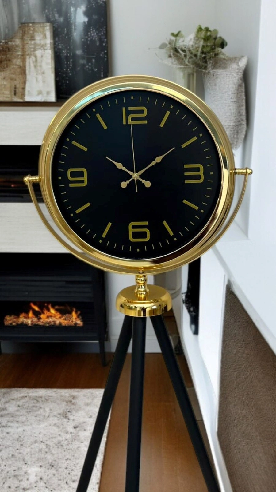 Gold metal çerçevesi ile siyah kadranın asil uyumu, ürüne lüks ve zamansız bir görünüm kazandırır. İnce formda tasarlanmış siyah tripod ayakları ise hem modern bir estetik sunar hem de saatin zeminde dengeli ve sağlam şekilde durmasını sağlar. Bu tasarım, salonlar, ofisler, lobiler, showroomlar ve prestijli yaşam alanları için ideal bir tamamlayıcıdır.