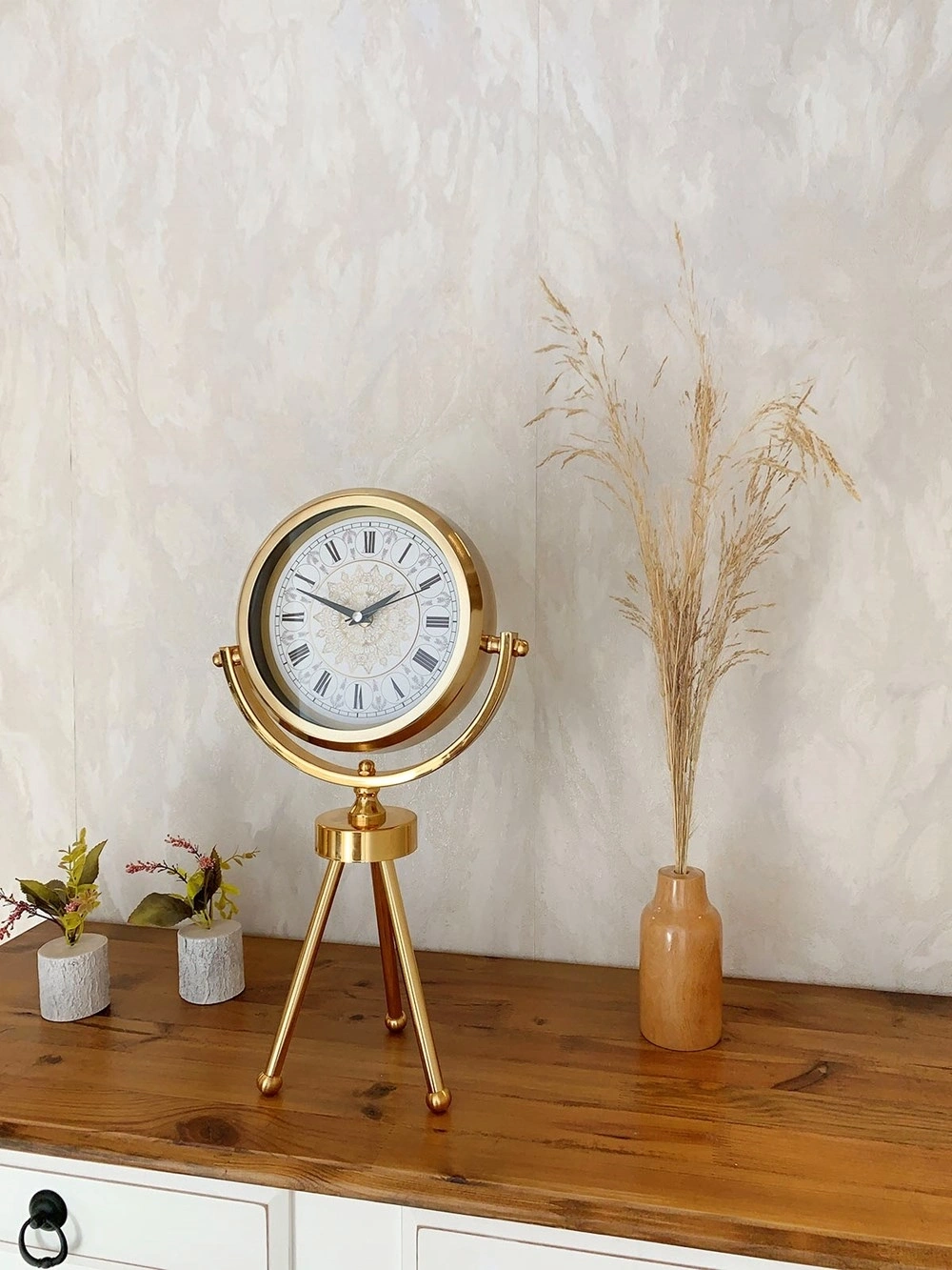 Gold Metal Mini Tripod Çini Desenli Roma Rakamı Masa Saati 45×26 cm
