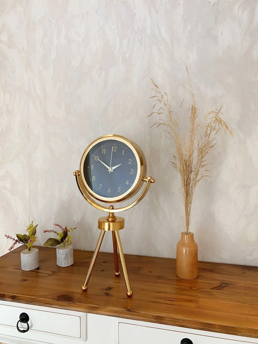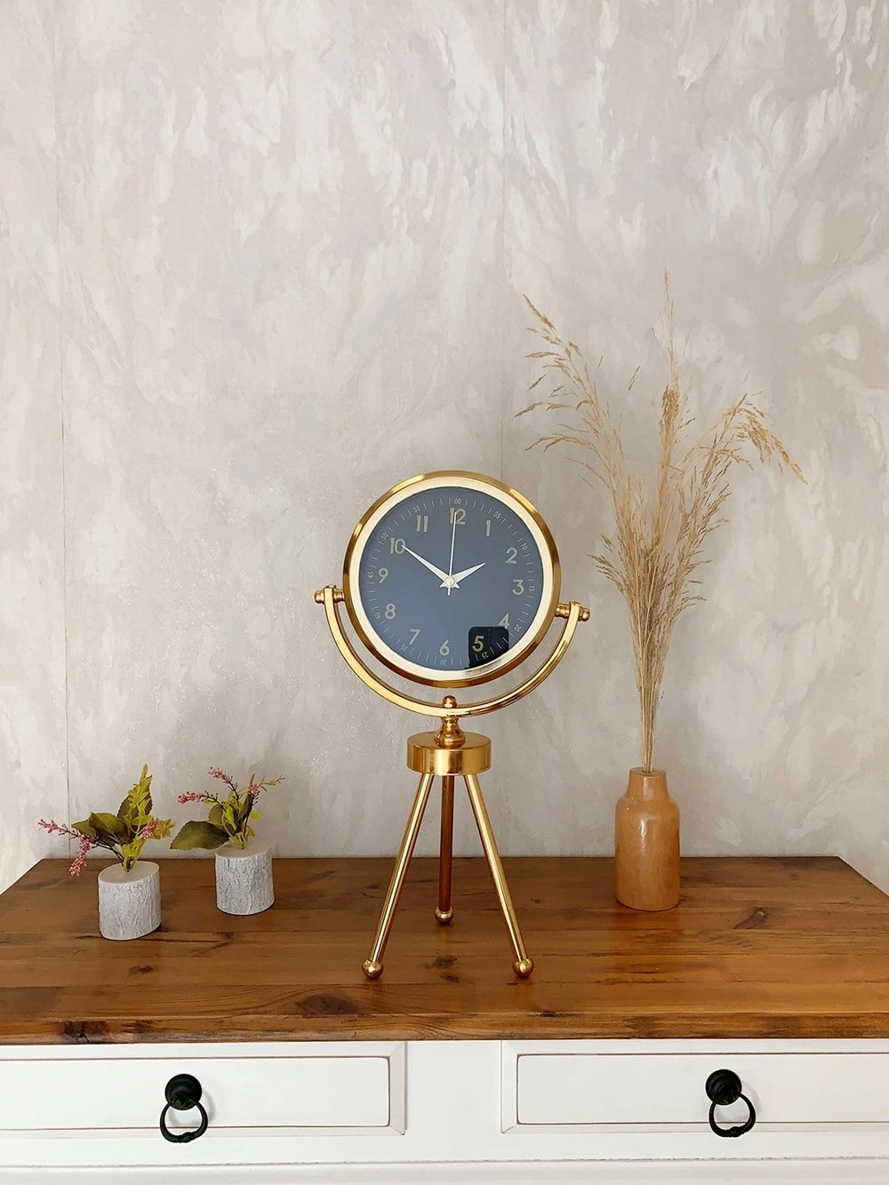 Şık ve modern tasarımıyla dikkat çeken  gold kaplama mini tripod masa saatimiz, sessiz akar saniye mekanizmasıyla konforlu bir kullanım sunar. Gerçek cam koruma paneli sayesinde uzun ömürlü ve dayanıklıdır. Estetik görünümüyle hem ev hem de iş yerleri için ideal bir dekoratif üründür.