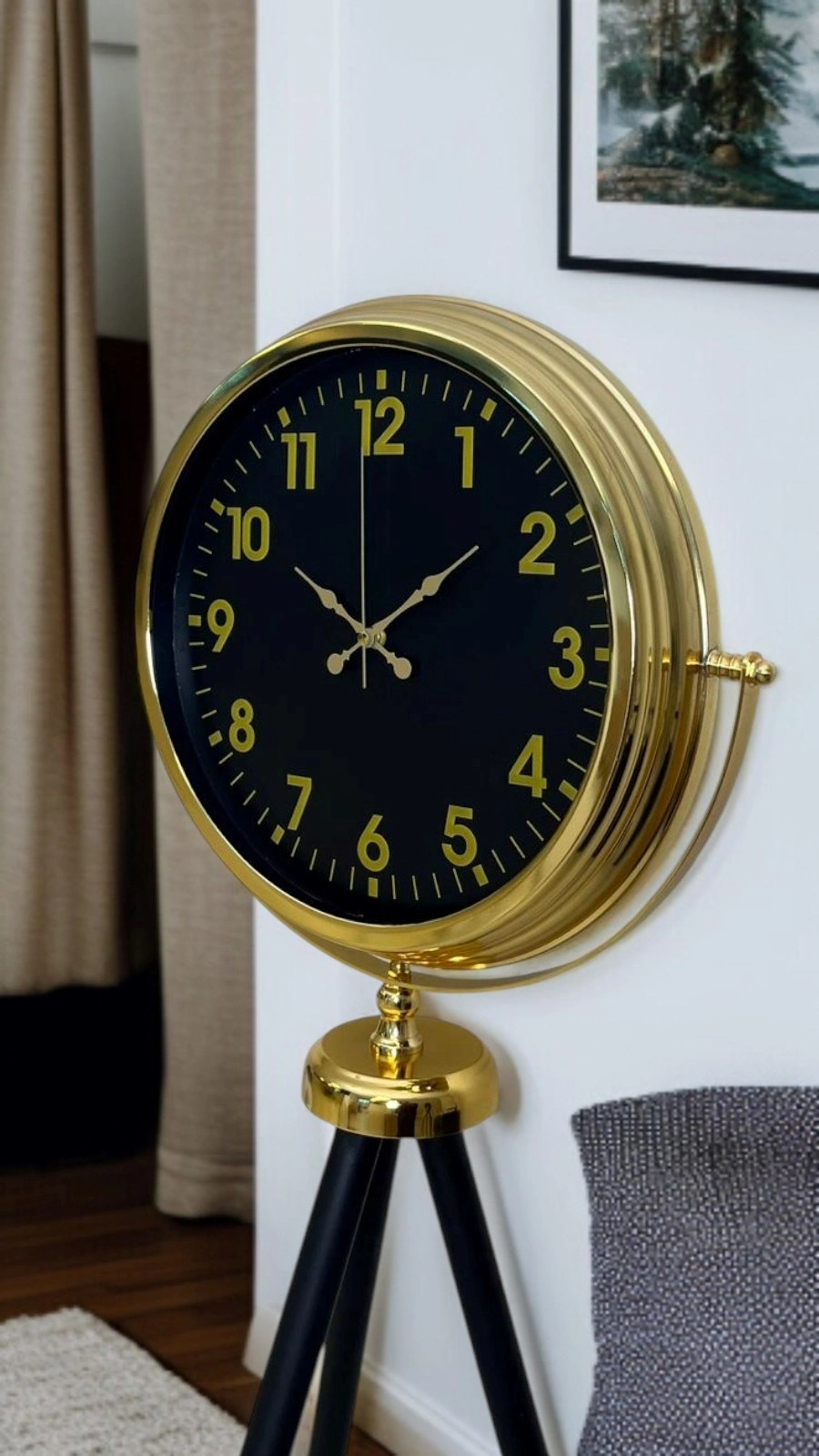 Gold metal çerçevesi ile siyah kadranın asil uyumu, saate lüks ve zamansız bir görünüm kazandırır. İnce formda tasarlanan siyah tripod ayakları, hem estetik hem de dengeli bir yapı sunarak saatin zeminde sağlam şekilde durmasını sağlar. Geniş ve sade kadran tasarımı, saatin uzaktan bile rahatlıkla okunmasına imkân tanır.