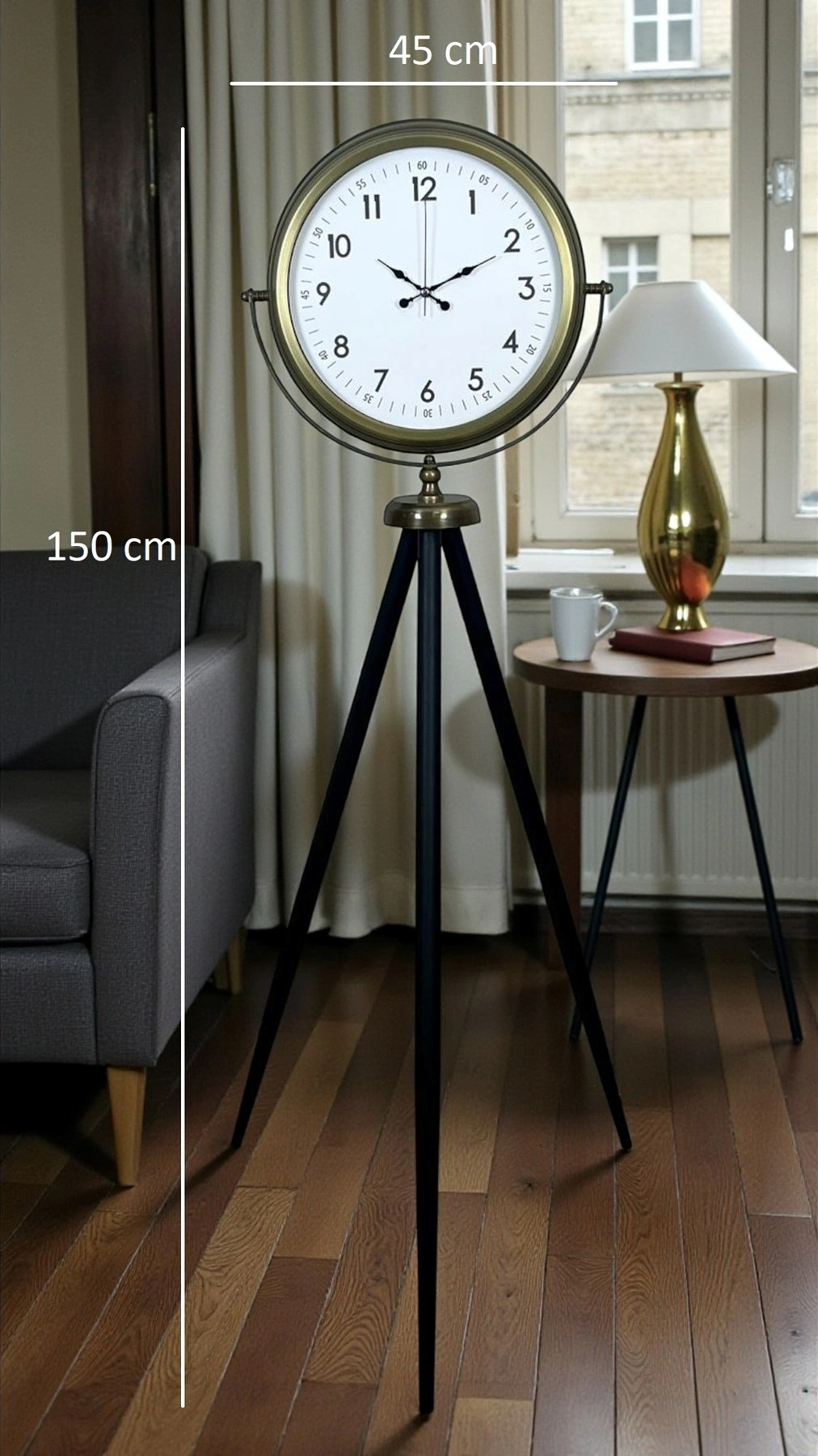 Tripod (üç ayaklı) yapısı sayesinde duvar montajına ihtiyaç duymaz. Dilediğiniz alana kolayca yerleştirilebilir ve taşınabilir. Salon köşeleri, ofisler, giriş holleri, otel lobileri, kafe ve restoranlar için dekoratif bir tamamlayıcıdır. Büyük boy yapısı sayesinde yalnızca bir saat değil, aynı zamanda mekânın odak noktası olan dekoratif bir obje görevi görür.