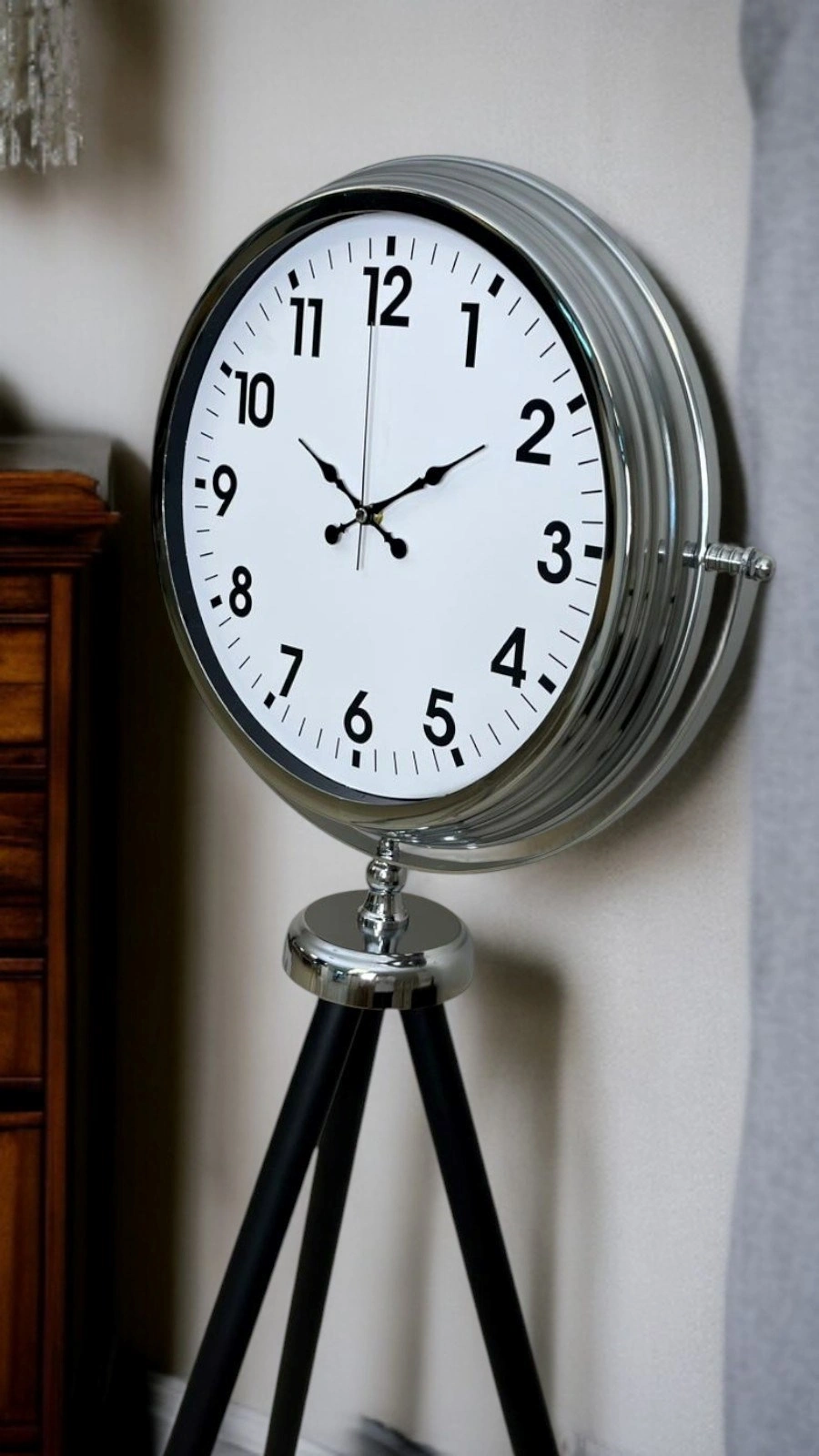 Modern çizgilerle zamansız tasarımı bir araya getiren bu krom tripod ayaklı saat, klasik saat anlayışının çok ötesinde, mekânlara güçlü bir karakter kazandırmak için tasarlanmıştır. 150 cm yüksekliği ve 45 cm genişliğiyle bulunduğu ortamda dikkat çeken bir odak noktası oluşturur. Sıradan duvar saatlerinden farklı olarak ayaklı yapısı sayesinde dekorasyonun bir parçası değil, başrolü olur.