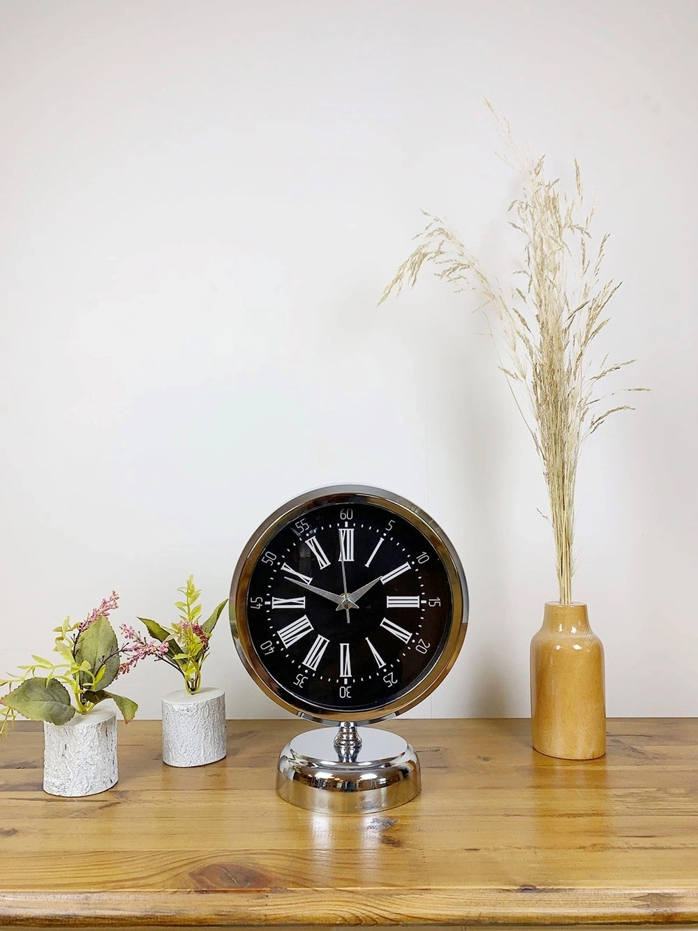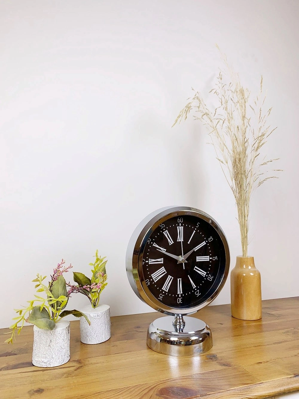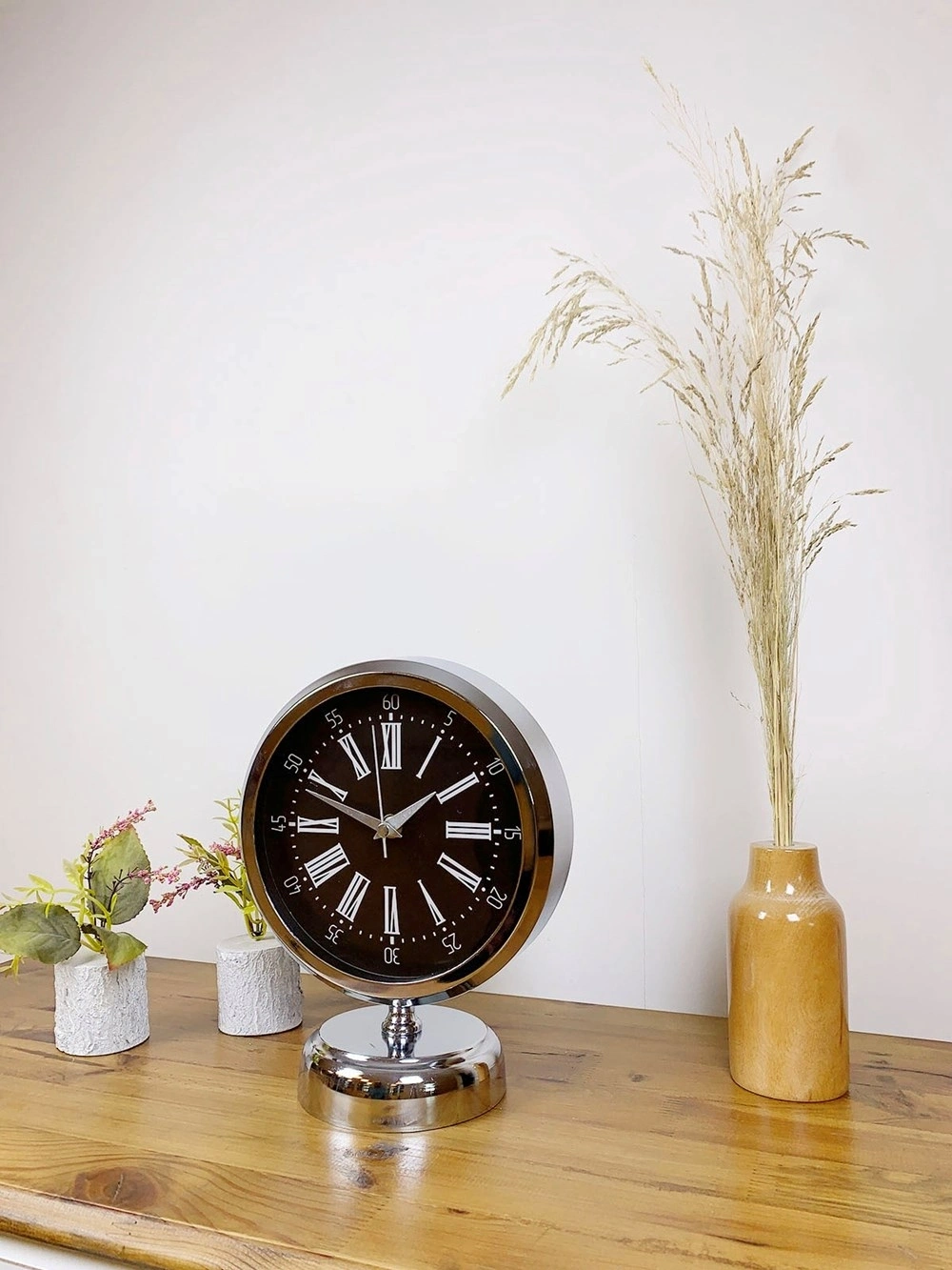 Şık ve modern tasarımıyla dikkat çeken  krom kaplama masa saatimiz, sessiz akar saniye mekanizmasıyla konforlu bir kullanım sunar. Gerçek cam koruma paneli sayesinde uzun ömürlü ve dayanıklıdır. Estetik görünümüyle hem ev hem de iş yerleri için ideal bir dekoratif üründür.