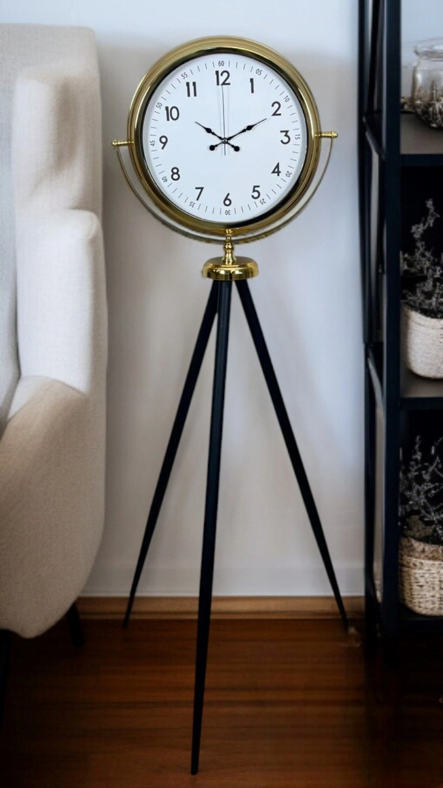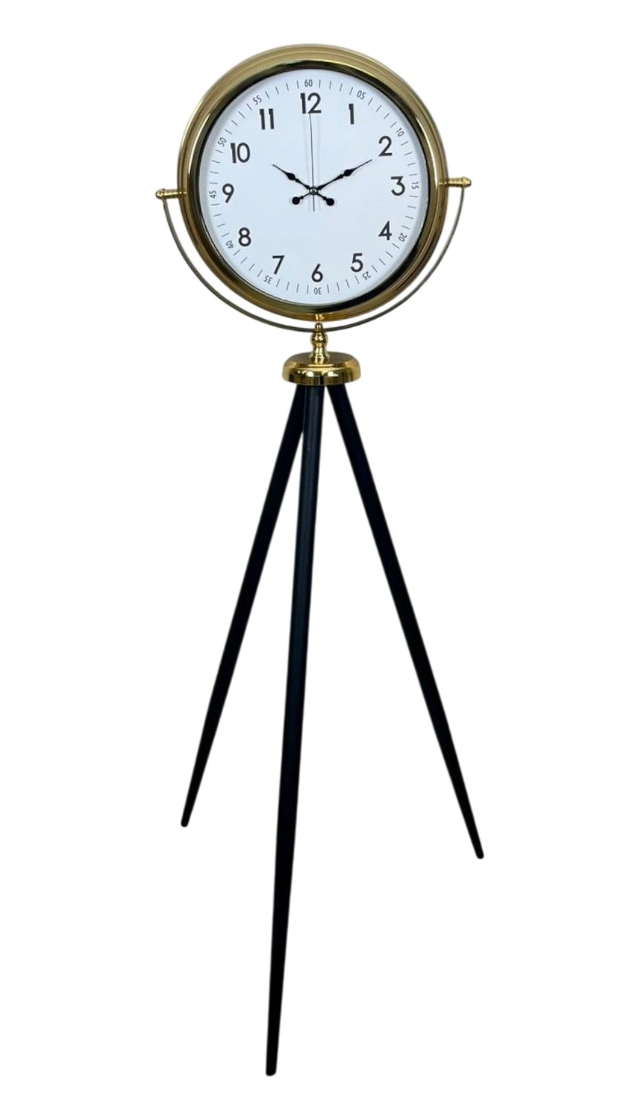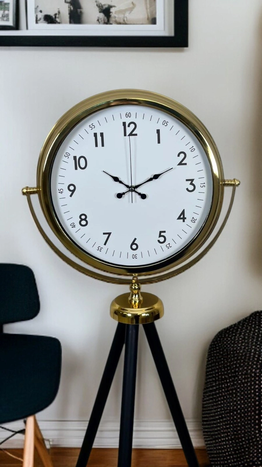 Net okunabilir rakamlı kadranı, zamansız bir tasarım anlayışı sunarken; tripod ayak formu ürüne modern ve özgün bir karakter kazandırır. Salon, ofis, otel lobisi, showroom ve prestijli yaşam alanları için ideal bir dekoratif saattir.