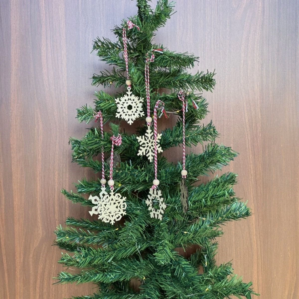 Yeni yılın büyüleyici atmosferini evinize taşıyan 6 Parça Kırmızı Beyaz İpli Kar Tanesi Model Ahşap Yılbaşı Ağaç Süsü, doğal ahşap dokusu ve zarif tasarımıyla yılbaşı dekorasyonunuzun vazgeçilmezi olacak.