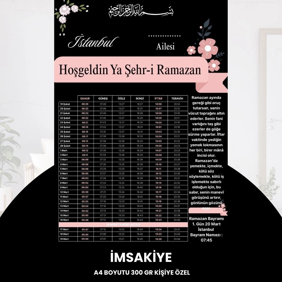 Ramazan ayının maneviyatını size özel bir dokunuşla taçlandırın! İster kendi aileniz için Örnek olarak "Kaya Ailesi" yazdırın, ister firmanızın reklamını yaparak müşterilerinize kalıcı bir hediye sunun. Yüksek Kalite: 300 gram kalın ve dayanıklı kağıda basılmaktadır (Kartpostal sertliğindedir).Tamamen Size Özel: Üzerine isim, soyisim, aile adı veya firma bilgilerinizi ekletebilirsiniz.Net Görünüm: A4 boyutunda (21x29.7 cm) okunaklı ve şık tasarım.⚠️ ÖNEMLİ SİPARİŞ NOTU: İmsakiyenizin doğru hazırlanabilmesi için, siparişinizi oluşturduktan hemen sonra "Satıcıya Soru Sor" panelinden;Yazılacak İsim veya Firma Adını,İmsakiye vakitlerinin hangi Şehir ve İlçe için olacağını iletmeyi lütfen unutmayınız. Aksi Takdirde İstanbul İmsakiye Gönderilecektir.