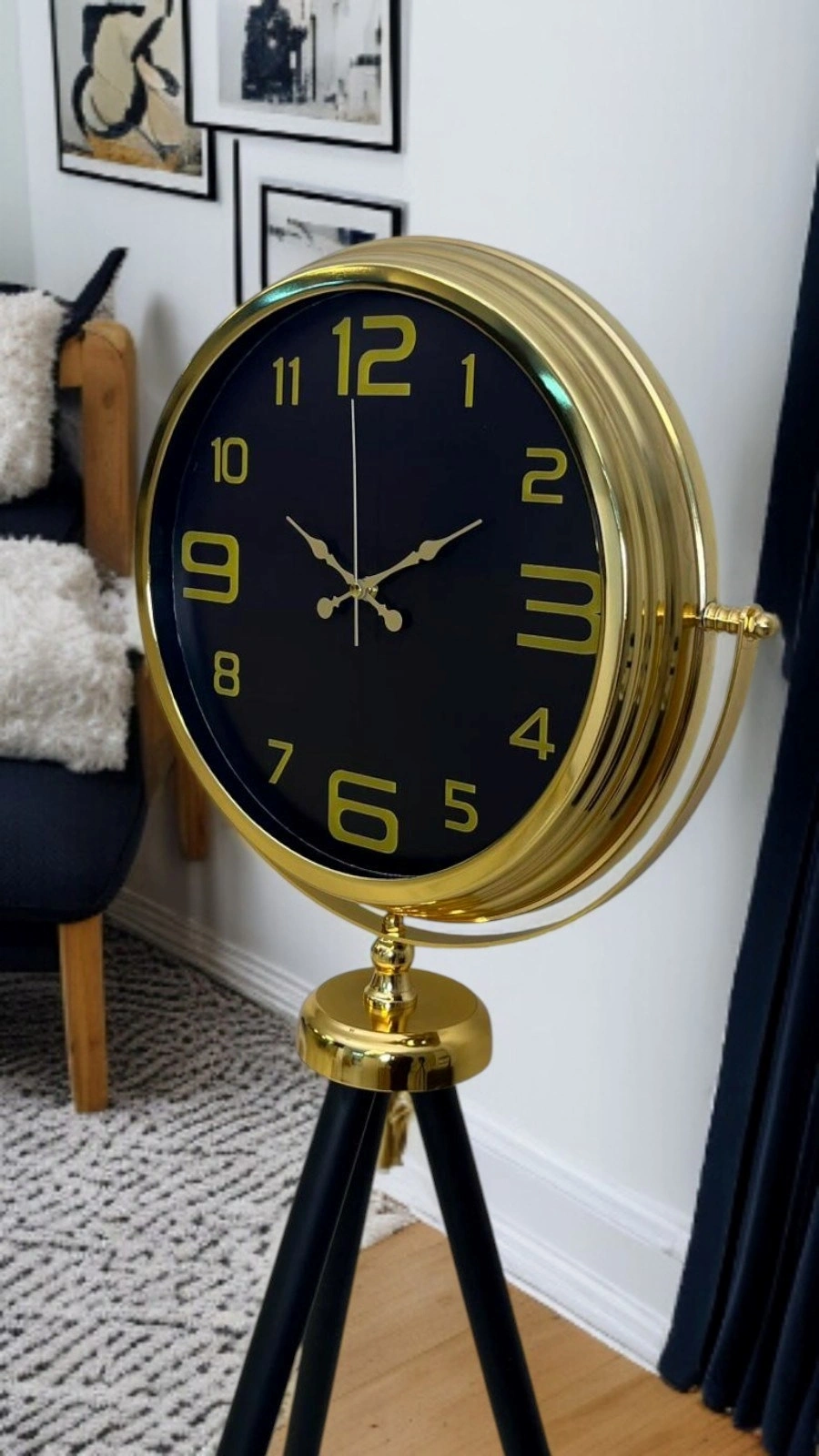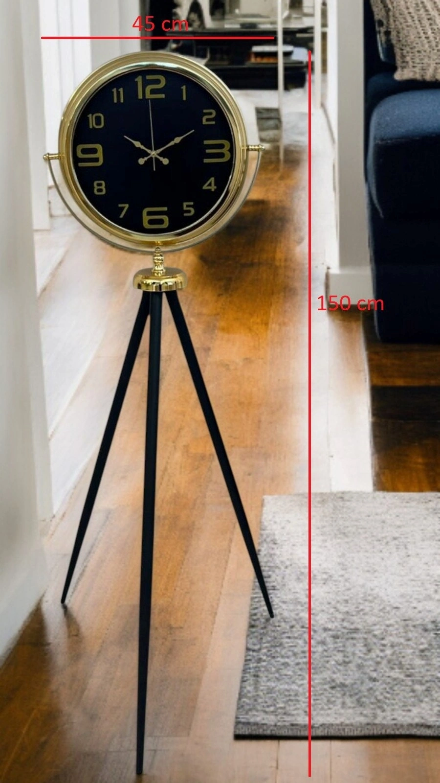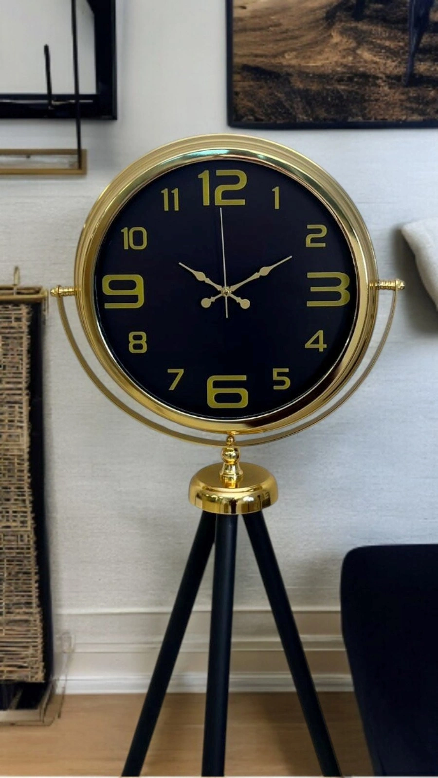 Gold metal çerçevesi ile derin siyah kadranın uyumu, lüks ve modern dekorasyon anlayışını yansıtırken; siyah tripod ayak yapısı saate dengeli, sağlam ve estetik bir görünüm kazandırır. İnce detaylarla tasarlanmış geniş kadranı sayesinde saat, uzaktan dahi rahatlıkla okunabilir.