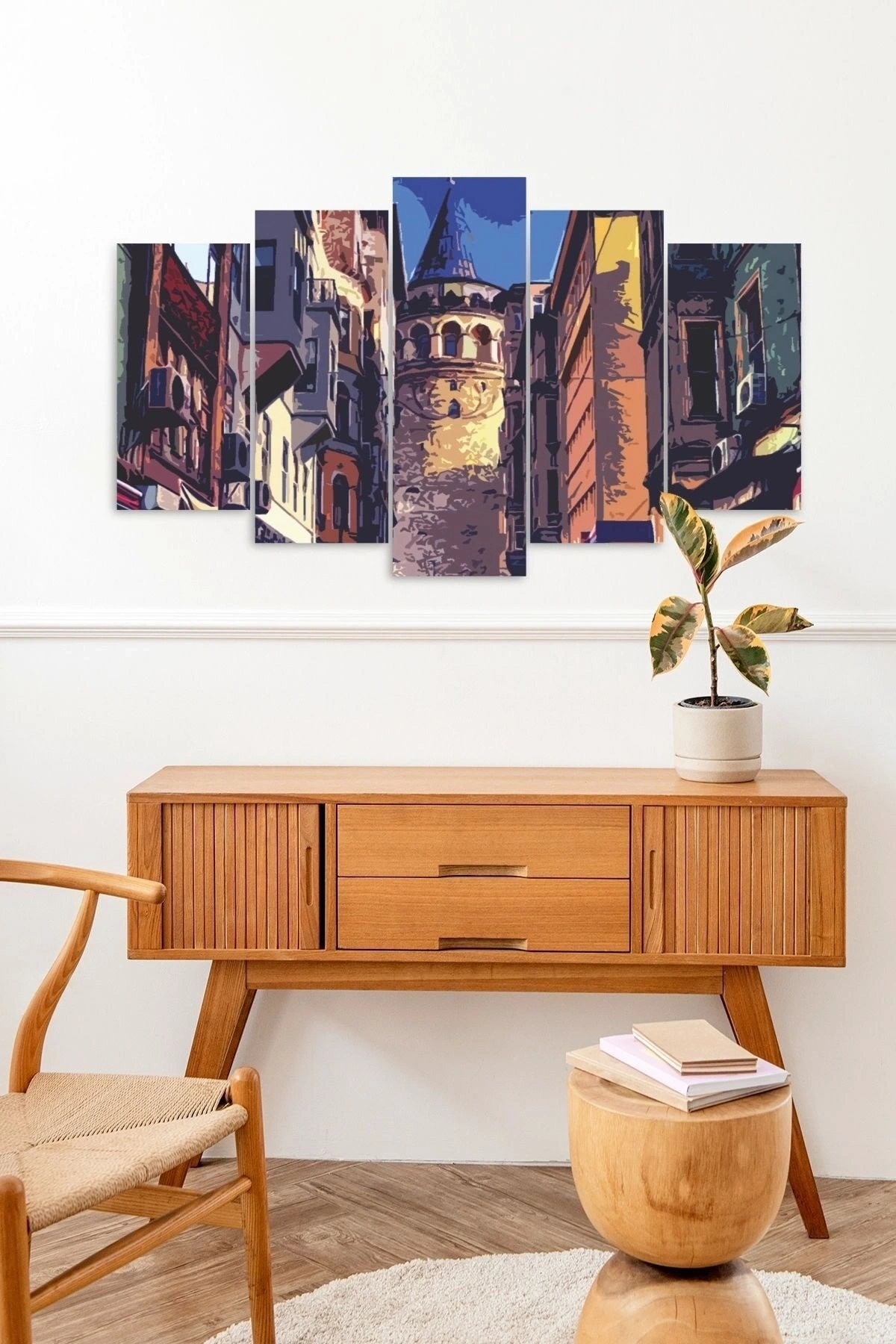 Modern tasarımıyla evinizin dekorasyonuna şıklık katan 5 parçalı MDF tablo, şehir manzarası temalı sanat eserleriyle mekanınıza estetik bir dokunuş sağlar; Kaliteli MDF malzemesi sayesinde uzun ömürlü kullanım sunar ve dayanıklılığıyla dikkat çeker; Ahşap yapısı ile doğal bir görünüm sergileyen bu tablo, mekanınıza sıcaklık ve samimiyet katar;
