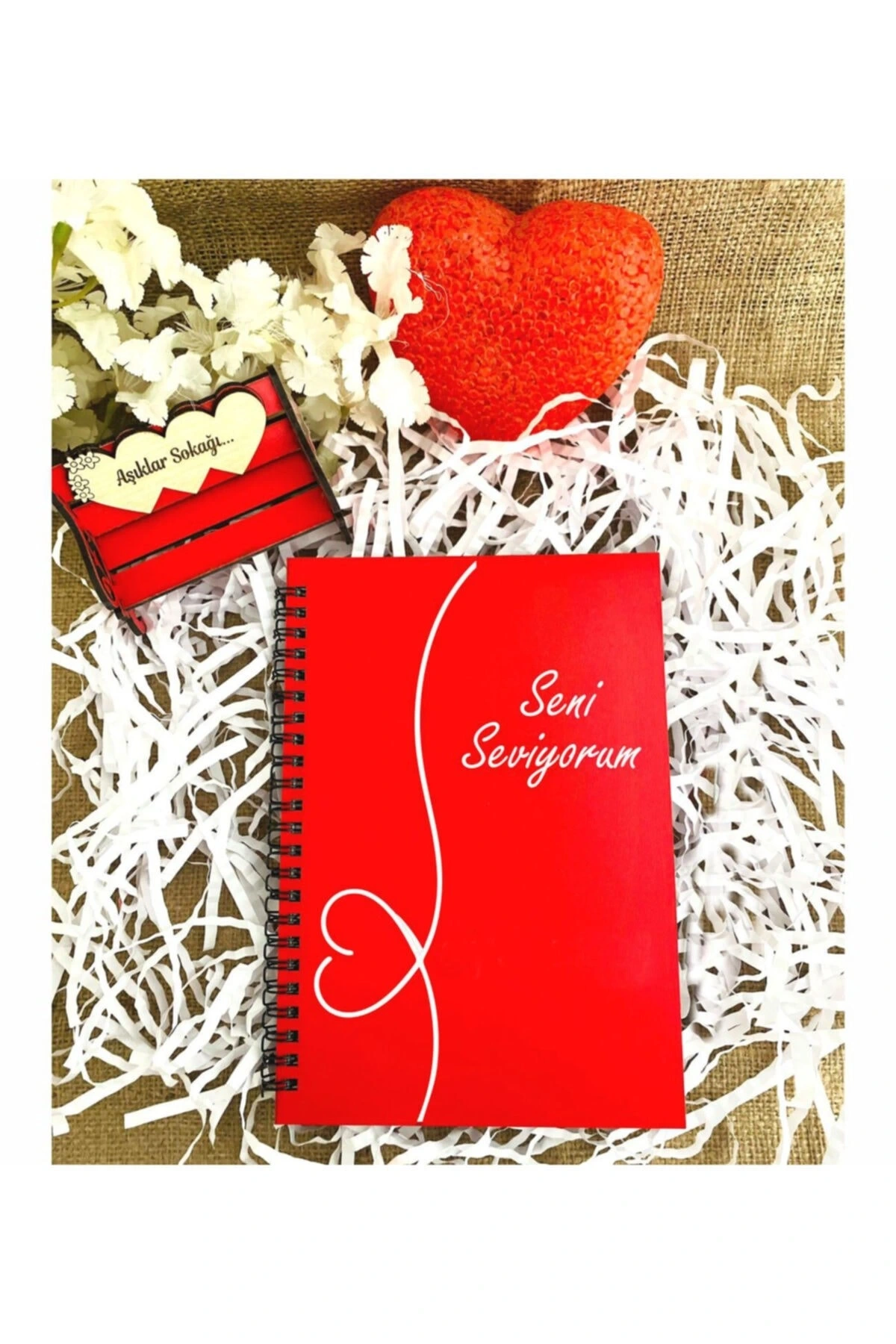 Sevgililer Günü Seni Seviyorum Yazılı Ahşap Defter Kalem Seti - Kırmızı