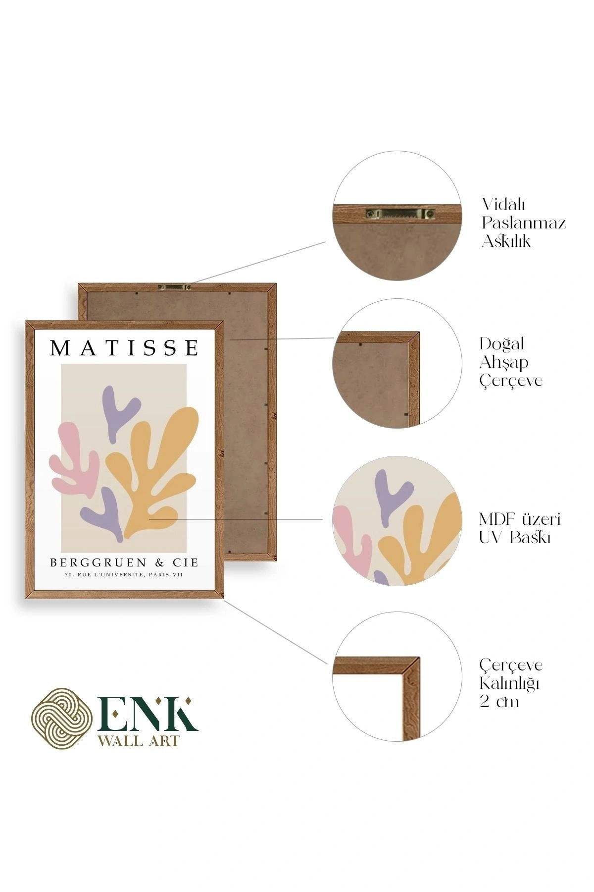 Tablolarımız gerçek ahşap çerçevelidir, çerçeve görünümlü değildir. ; ENK Wall Art Olarak Ahşap Çerçeveli Tablolar Üretiyoruz. ; Tablolarımız tek parça, 3 Parça, 5 Parça ve daha çok kategoride tasarımcılarımız tarafından ev ve ofisleriniz duvarları süslemek için tasarlanmaktadır. ; Ahşap Çerçeveli Duvar Tabloları ile yaşam alanlarınıza yepyeni bir görünüm kazandırın. ; Yıllarca dayanacağından emin olduğumuz sağlam çerçevelere sahip yüksek kaliteli ahşaptan üretilmiştir. ; İster bir köşeyi süslemek isteyin, ister evinizi yenilemek , bu ahşap tablolar herhangi bir yaşam alanına stil ve işlev getirecektir. ; Duvara kolay bir şekilde monte edilir. ; Uzun ömürlü kullanım için sağlam ahşap çerçeveden yapılmış, dayanıklı ve güçlü. ; Duvara monte edilebilir tasarımı, yaşam alanlarında veya yatak odalarında duvara kolayca asılmasını sağlar. ; Pürüzsüz üst yüzeyi temiz kalmayı kolaylaştırır. ; Herhangi bir stile uyacak şekilde çeşitli renklerde gelir. ; Kolay yeniden düzenleme için hafif ve portatif. ; Küçük oturma odaları veya dar alanlar için mükemmel boyut. ; Eve taşınma hediyesi olarak idealdir. ; Herhangi bir evin dekorunu süslemek için harika bir yol. ; Herhangi bir modern veya çağdaş iç tasarıma mükemmel bir katkı. ; Tablo içi 3 mm mdf (ahşap) malzeme üzeri uv baskıdır. ; Renkler canlı ve solma yapmaz. ; Kırılma, bükülme ve çizilmeye karşı dayanıklıdır.;