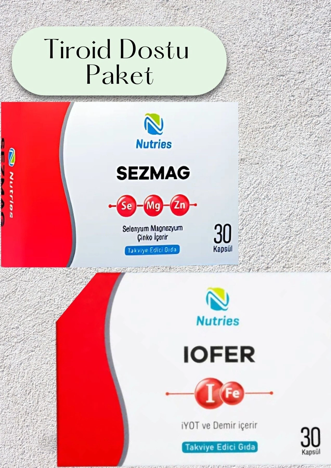 İçerik:- Nutries Sezmag: 200 mcg selenyum, 15 mg çinko, 57 mg magnezyum sitrat, 800 mcg A vitamini, 20 mg E vitamini ve 50 mg alfa lipoik asit içerir. Bu bileşenler, tiroid hormonlarının düzenlenmesine, bağışıklık sisteminin desteklenmesine ve hücresel enerji üretiminin artırılmasına yardımcı olur. [1]- Nutries Iofer: Her kapsülde 150 mcg potasyum iyodür ve 17 mg demir sülfat bulunur. İyot, tiroid hormonlarının üretimi için gereklidirken, demir vücudun oksijen taşıma kapasitesini artırarak enerji seviyelerini destekler. [2]Açıklama:Bu özel kombinasyon, tiroid sağlığını desteklemek amacıyla formüle edilmiştir. Selenyum ve iyot, tiroid hormonlarının üretimi ve düzenlenmesinde kritik rol oynar. Çinko ve demir, bağışıklık sistemi fonksiyonlarını ve enerji metabolizmasını destekler. Magnezyum, A ve E vitaminleri ile alfa lipoik asit ise antioksidan savunmayı güçlendirerek tiroid fonksiyonlarını optimize etmeye yardımcı olur.Bu paket, özellikle Hashimoto tiroiditi ve hipotiroidi gibi tiroid fonksiyon bozuklukları yaşayan bireyler için eksik mineralleri tamamlayıcı bir destek sunar.
