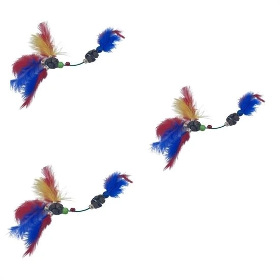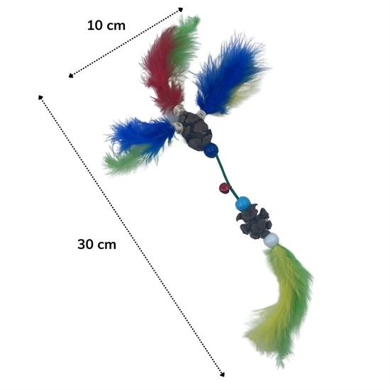 Bu kedi oyuncağı renkli tüyler tahta bir top ve bir zilden yapılmıştır. Bu renkli ve parlak tüyler kediler için görsel simüle edici ve ses çıkartan zilli top ilgilerini çekmek için harikadır.