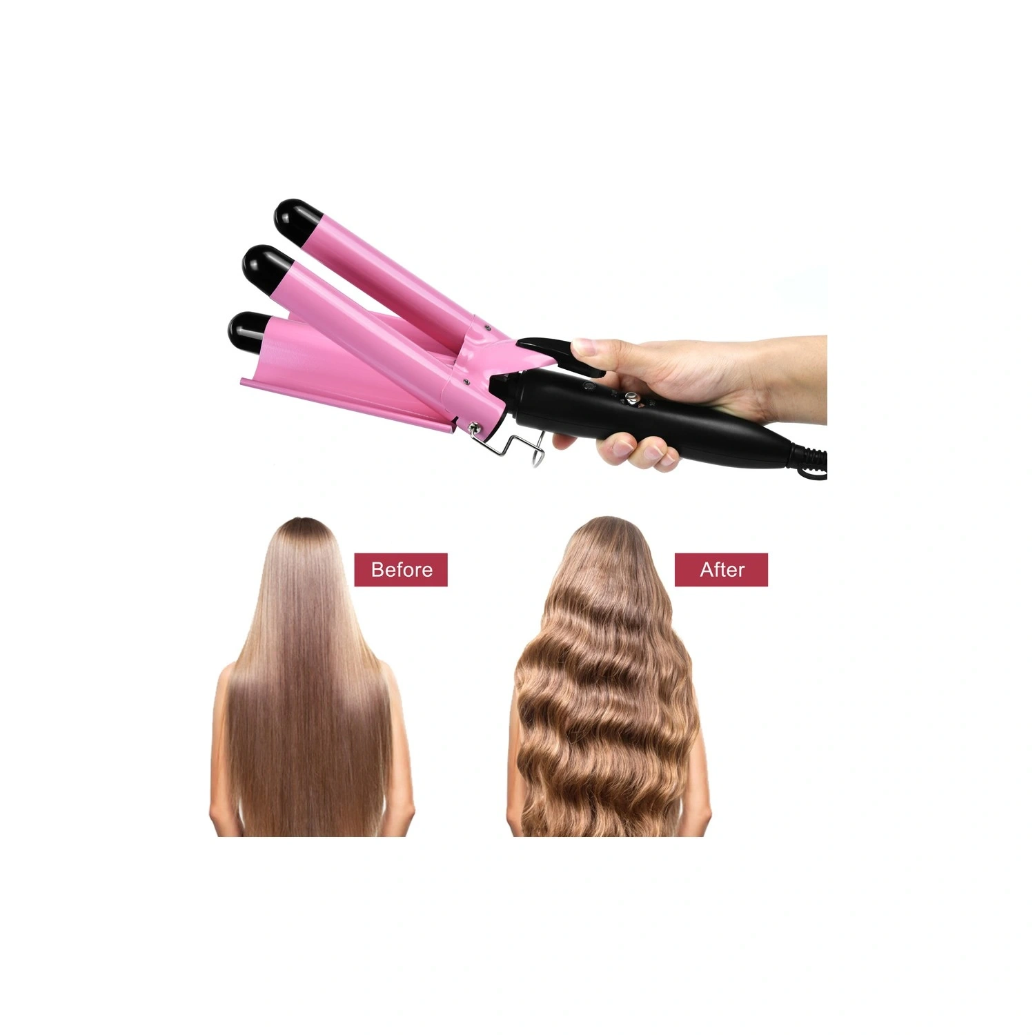 3 namlulu saç kıvırıcı, seçebileceğiniz 25mm çapında varil vardır, tüm orta uzunlukta ve uzun saçlarda çalışır, flört, parti, akşam, düğün için uygun farklı boyutlarda doğal ve güzel S dalgaları yaratır.