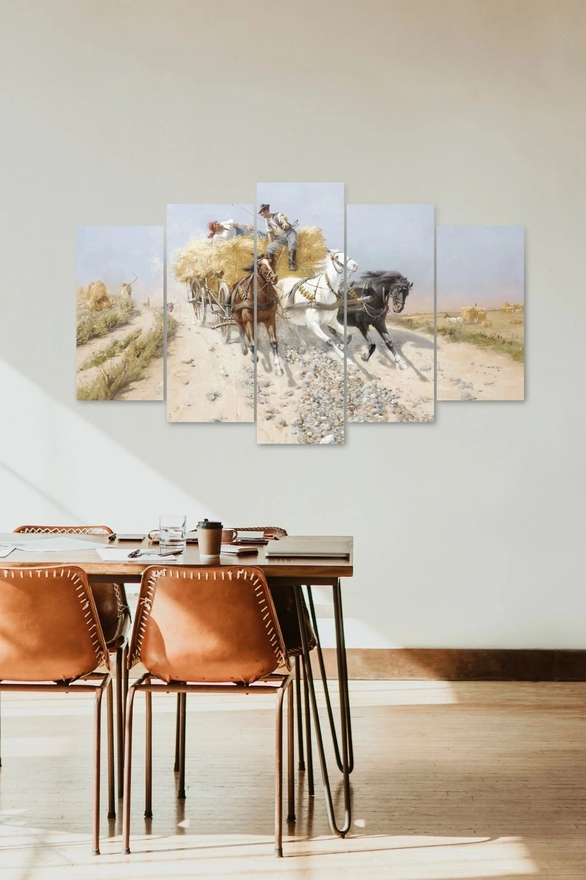 Modern tasarımıyla ev ve ofis dekorasyonunuza şıklık katan at arabası temalı 5 parçalı MDF tablo; Dayanıklı ahşap malzemesiyle uzun ömürlü kullanım sunar ve estetik görünümüyle dikkat çeker; Her bir parçası ayrı ayrı dekoratif bir dokunuş sağlar, mekanınıza özgün bir hava katar;