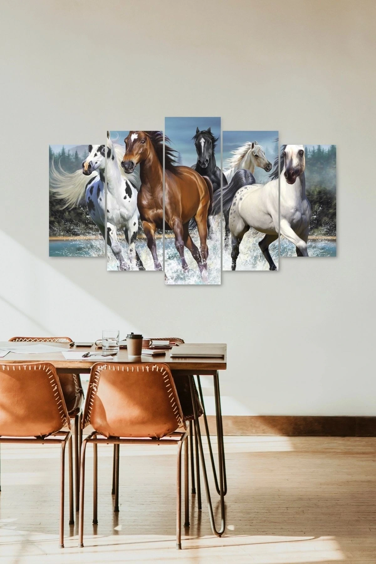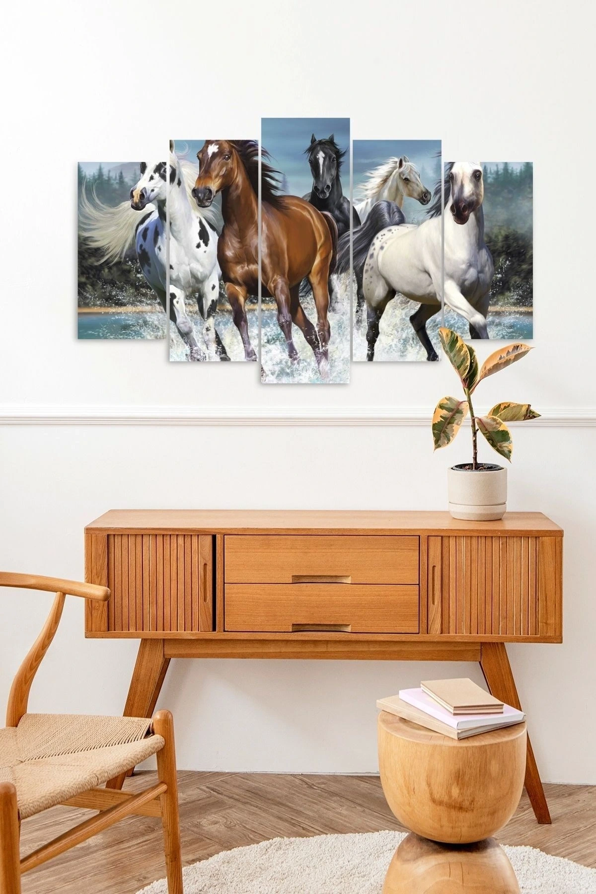 Modern tasarımıyla ev ve ofis dekorasyonunuza şıklık katan 5 parçalı ahşap tablo, mekanınıza doğal bir dokunuş katıyor; Dayanıklı MDF malzemesi sayesinde uzun ömürlü kullanım sunar ve kolay temizlenebilir yüzeyi ile pratik bir kullanım sağlar; Her bir parçada detaylı işçilikle işlenmiş at temalı tasarım, dekoratif bir atmosfer yaratırken aynı zamanda estetik bir görünüm sunar;