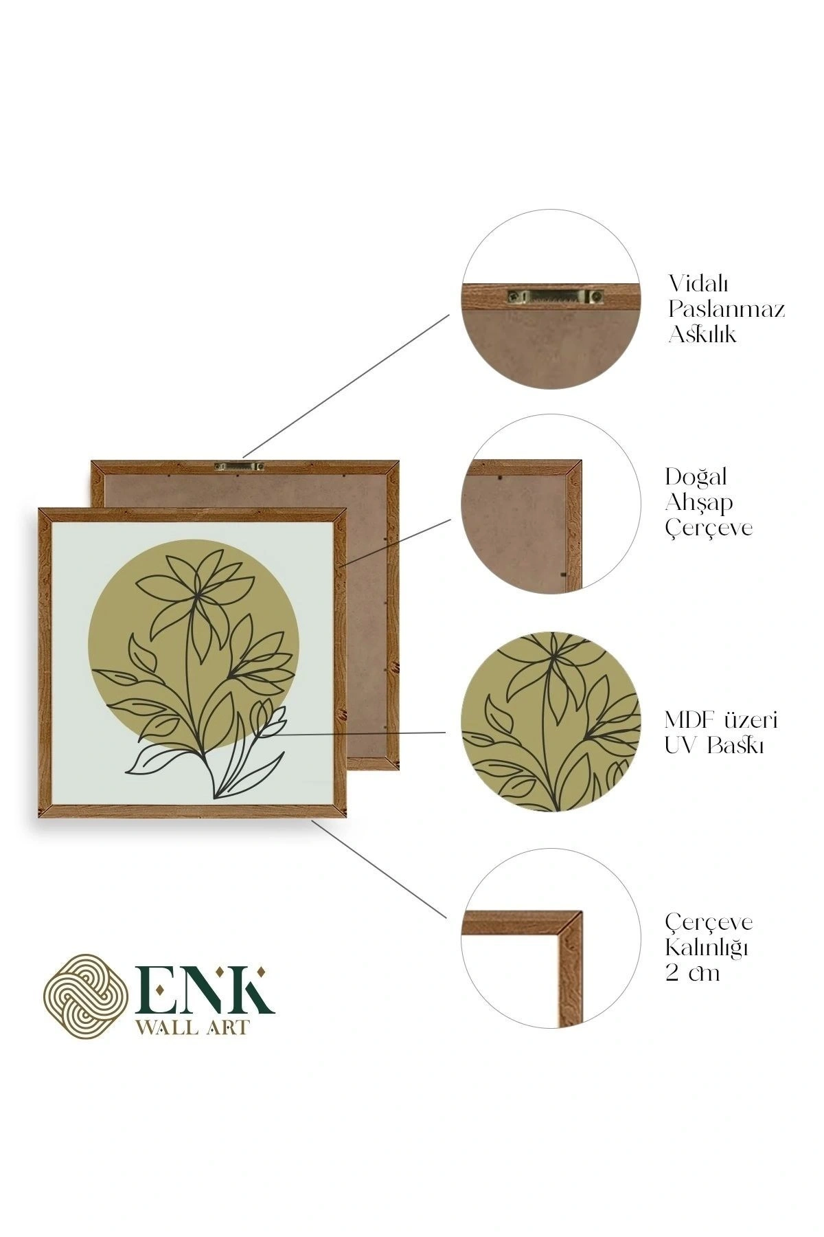 Tablolarımız gerçek ahşap çerçevelidir, çerçeve görünümlü değildir. ; ENK Wall Art Olarak Ahşap Çerçeveli Tablolar Üretiyoruz. ; Tablolarımız tek parça, 3 Parça, 5 Parça ve daha çok kategoride tasarımcılarımız tarafından ev ve ofisleriniz duvarları süslemek için tasarlanmaktadır. ; Ahşap Çerçeveli Duvar Tabloları ile yaşam alanlarınıza yepyeni bir görünüm kazandırın. ; Yıllarca dayanacağından emin olduğumuz sağlam çerçevelere sahip yüksek kaliteli ahşaptan üretilmiştir. ; İster bir köşeyi süslemek isteyin, ister evinizi yenilemek , bu ahşap tablolar herhangi bir yaşam alanına stil ve işlev getirecektir. ; Duvara kolay bir şekilde monte edilir. ; Uzun ömürlü kullanım için sağlam ahşap çerçeveden yapılmış, dayanıklı ve güçlü. ; Duvara monte edilebilir tasarımı, yaşam alanlarında veya yatak odalarında duvara kolayca asılmasını sağlar. ; Pürüzsüz üst yüzeyi temiz kalmayı kolaylaştırır. ; Herhangi bir stile uyacak şekilde çeşitli renklerde gelir. ; Kolay yeniden düzenleme için hafif ve portatif. ; Küçük oturma odaları veya dar alanlar için mükemmel boyut. ; Eve taşınma hediyesi olarak idealdir. ; Herhangi bir evin dekorunu süslemek için harika bir yol. ; Herhangi bir modern veya çağdaş iç tasarıma mükemmel bir katkı. ; Tablo içi 3 mm mdf (ahşap) malzeme üzeri uv baskıdır. ; Renkler canlı ve solma yapmaz. ; Kırılma, bükülme ve çizilmeye karşı dayanıklıdır.;