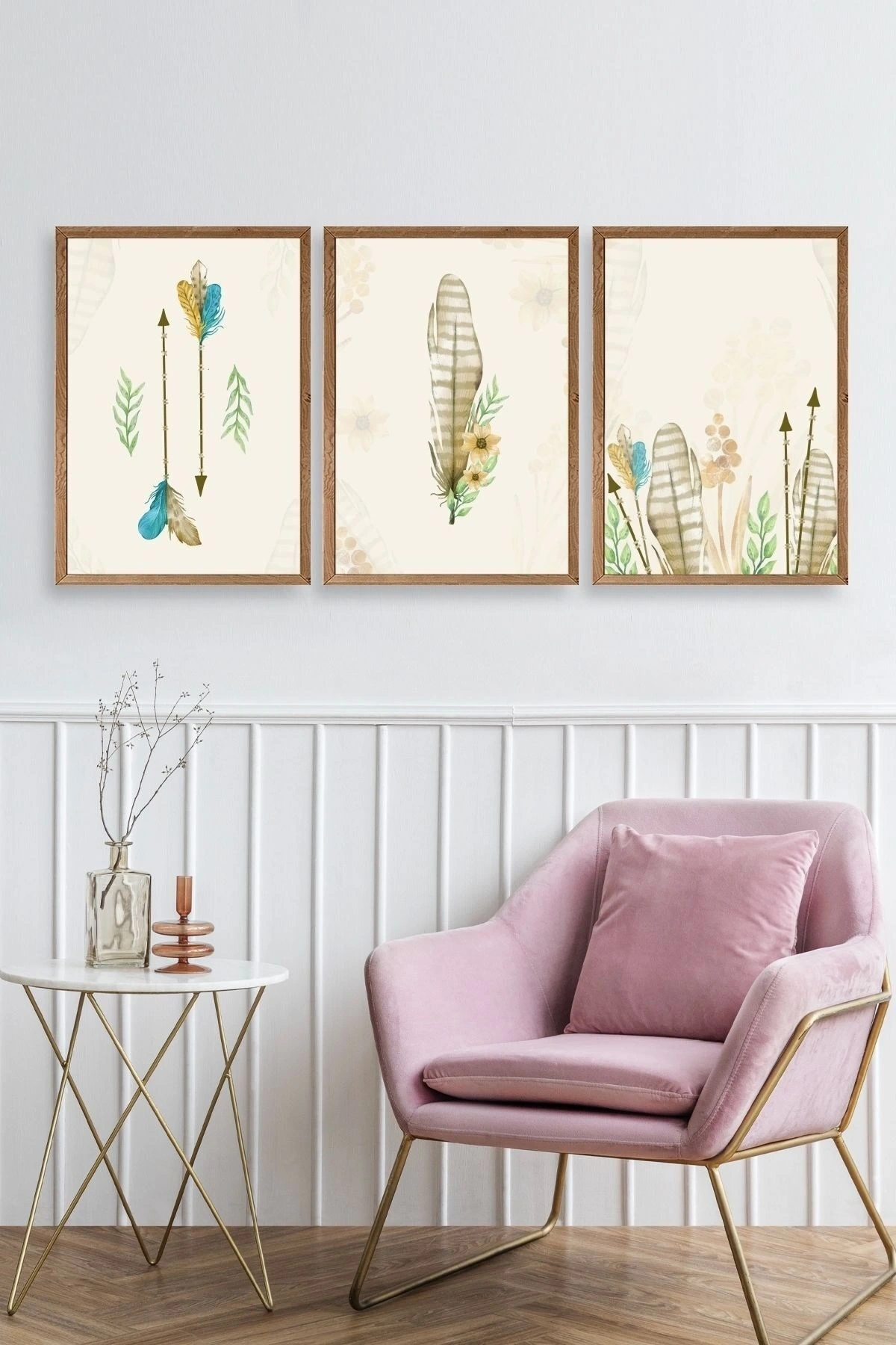 Çiçekli Desenler Üçlü Ahşap Çerçeveli Tablo 30 x 42