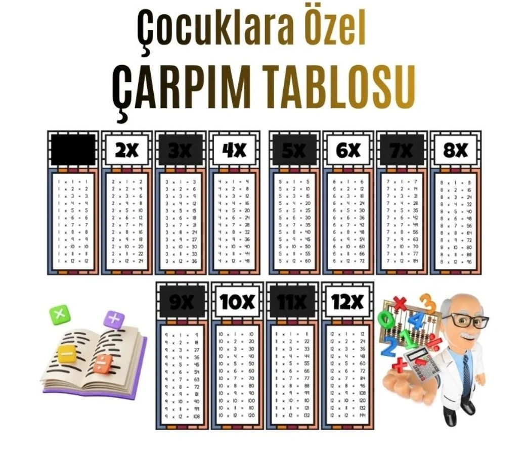 Matematik eğitimi artık çok daha eğlenceli ve kolay! Eğlenceli Çarpım Tablosu Afişi , çocukların 12'ye kadar çarpım hikayelerini keyifle öğrenebilecekleri renkli ve dikkat çekici bir yapıya sahiptir.