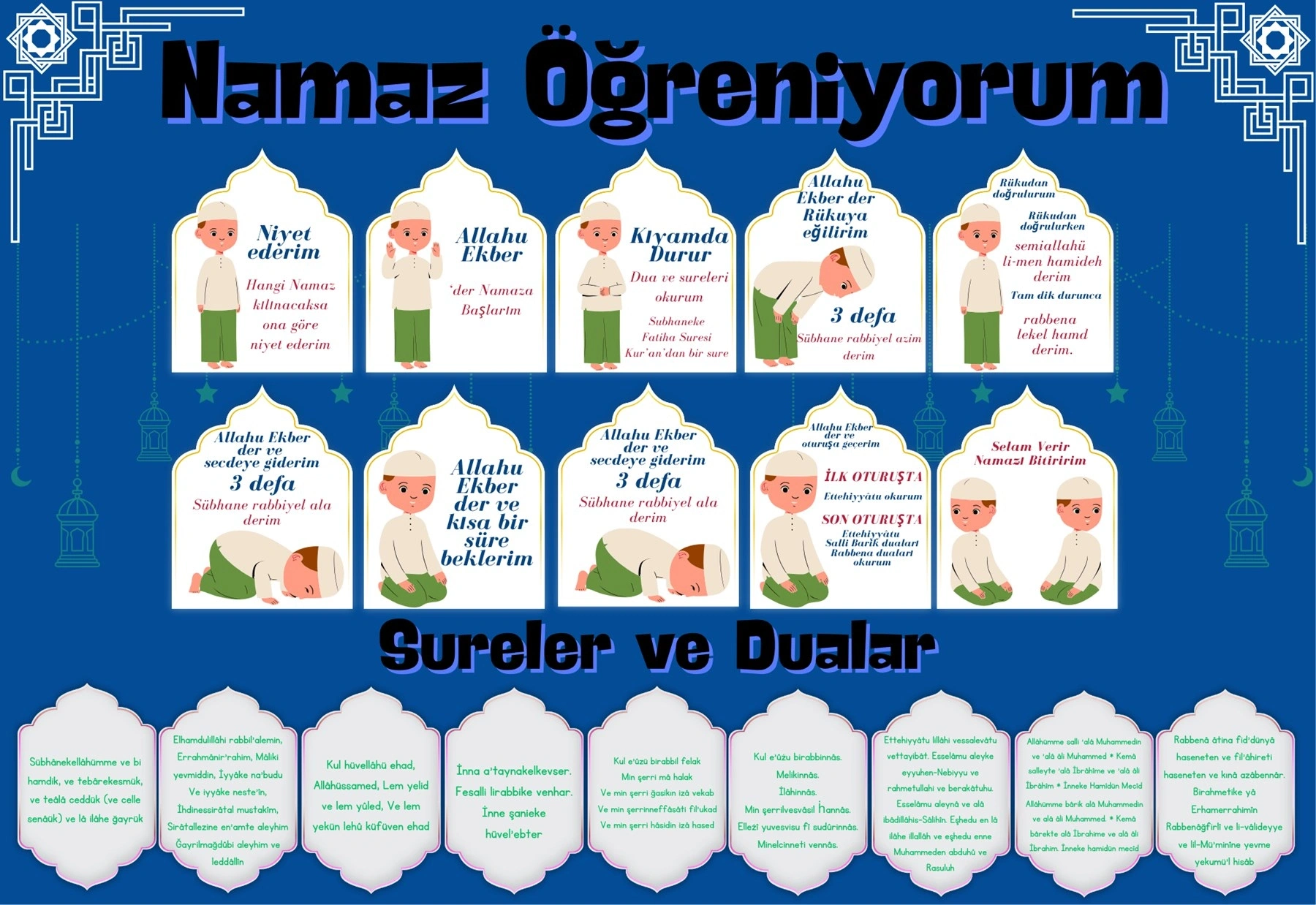 Namaz kılmayı öğrenmek artık çok daha kolay ve eğlenceli! Renkli ve Figürlü "Namaz Öğreniyorum" Afişi , çocuklar için özel olarak tasarlanmış görseller ve sade anlatımlarla İslam'ın bu önemli ibadetini öğretmeyi amaçlıyor.