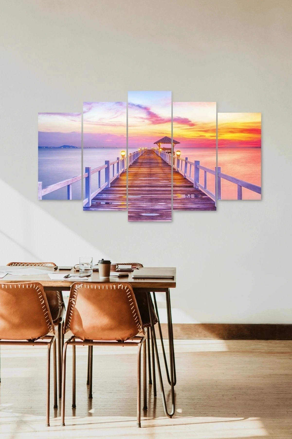 Modern tasarımıyla evinizin dekorasyonuna şıklık katan deniz manzara temalı 5 parçalı MDF tablo; Dayanıklı ahşap malzemesi ile uzun ömürlü kullanım sunar ve estetik görünümüyle mekanınıza doğal bir dokunuş ekler; Deniz manzarasının huzur veren atmosferini yaşam alanlarınıza taşıyan bu tablo, hem göze hitap eder hem de ruhunuzu dinlendirir;