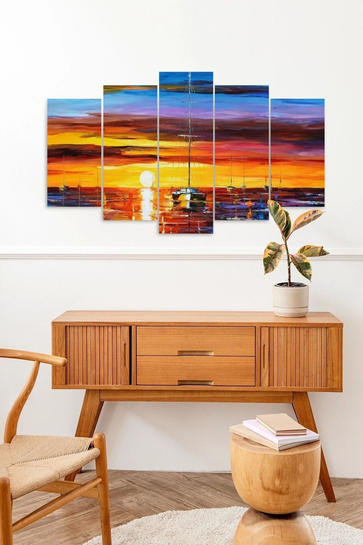 Modern dekorasyonun vazgeçilmez bir parçası olan bu 5 parçalı MDF tablo, deniz manzarası temalı tasarımıyla mekanınıza huzur ve sakinlik katar; Kaliteli MDF malzemesi sayesinde uzun ömürlü kullanım sunar ve dayanıklılığıyla öne çıkar; Modern stil sahibi olan bu tablo, evinizin veya ofisinizin atmosferini çağdaş bir dokunuşla zenginleştirir;