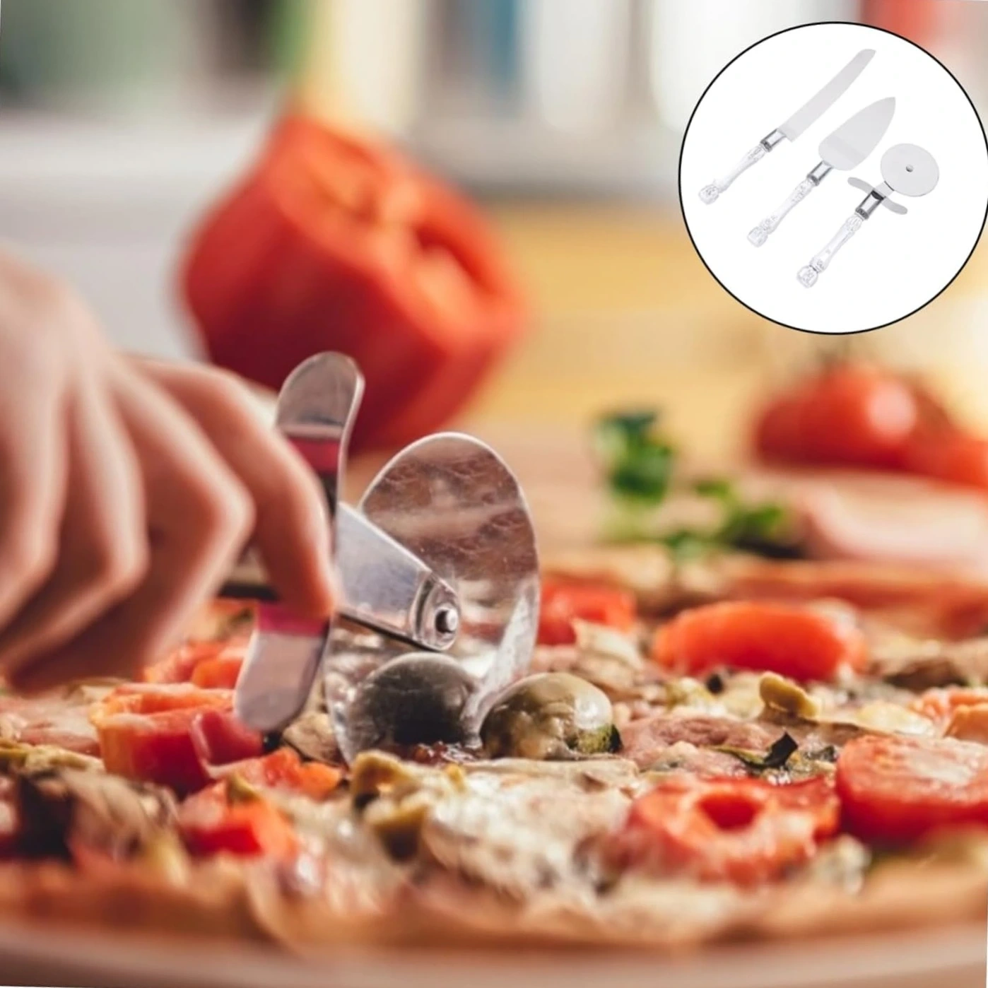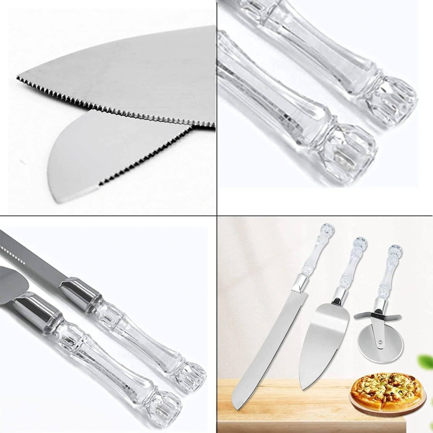 3 PARÇA SERVİS SETİÜrün Özellikleri3 Parça Servis Seti, şeffaf sap tasarımı ve paslanmaz metal yüzeyleriyle mutfakta estetik ve fonksiyonel kullanım sunar. Pizza kesme aparatı, uzun servis bıçağı ve geniş spatula içeren bu set; pizza, börek, pasta, kek ve tatlı servislerinde kesim ve sunumu kolaylaştırır. Keskin dişli bıçak pizza dilimlerini dağılmadan kesmenizi sağlarken spatula, dilimleri düzgün şekilde tabağa aktarmanıza yardımcı olur. Yuvarlak pizza kesici ise hamur ve pizza tabanlarında pratik kullanım imkânı sunar. Şeffaf sap detayları sofralarda zarif bir görünüm oluştururken dayanıklı yapısı uzun süreli kullanım sağlar. Günlük mutfak hazırlıklarından özel davet ve organizasyonlara kadar her ortamda kullanıma uygundur ve hijyenik ambalajıyla teslim edilir.Paket İçeriği1 Adet Pizza Kesici1 Adet Dişli Bıçak1 Adet Servis Spatulası