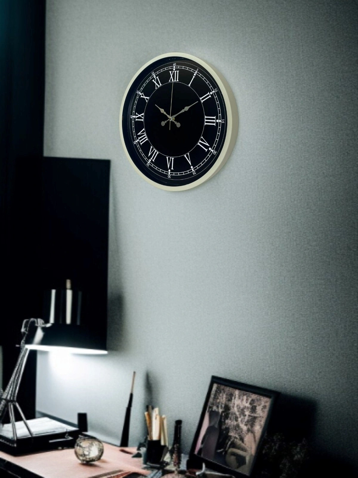 Krem renkli çerçevesi ve siyah zemin üzerindeki Roma rakamlı kadran tasarımıyla öne çıkan bu 36 cm duvar saati; zamansız bir şıklık sunar. Klasik saat estetiğini modern çizgilerle buluşturan tasarımı sayesinde salon, oturma odası ve ofis gibi alanlarda güçlü ve asil bir duruş sergiler. İnce dakika göstergeleri ve dengeli kadran yapısı, zamanı net ve rahat bir şekilde okumayı sağlar.
