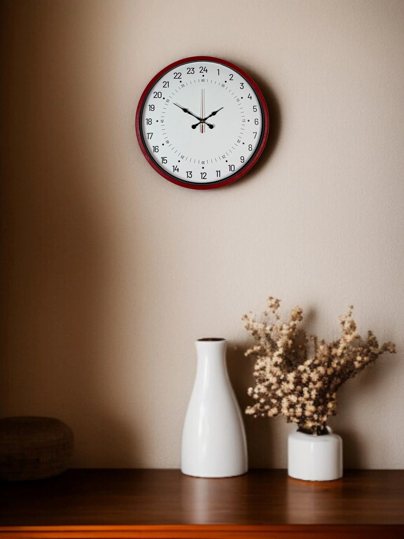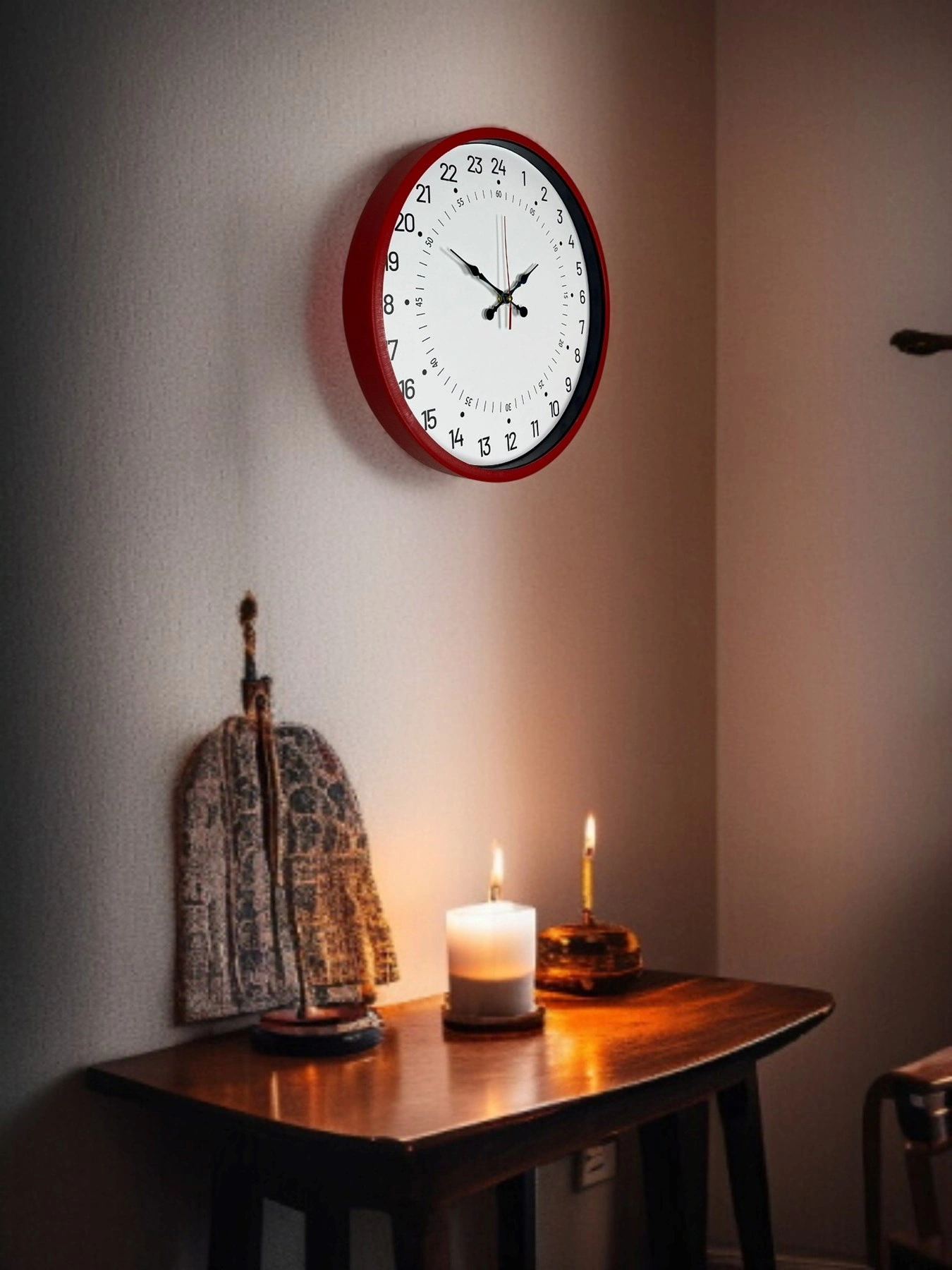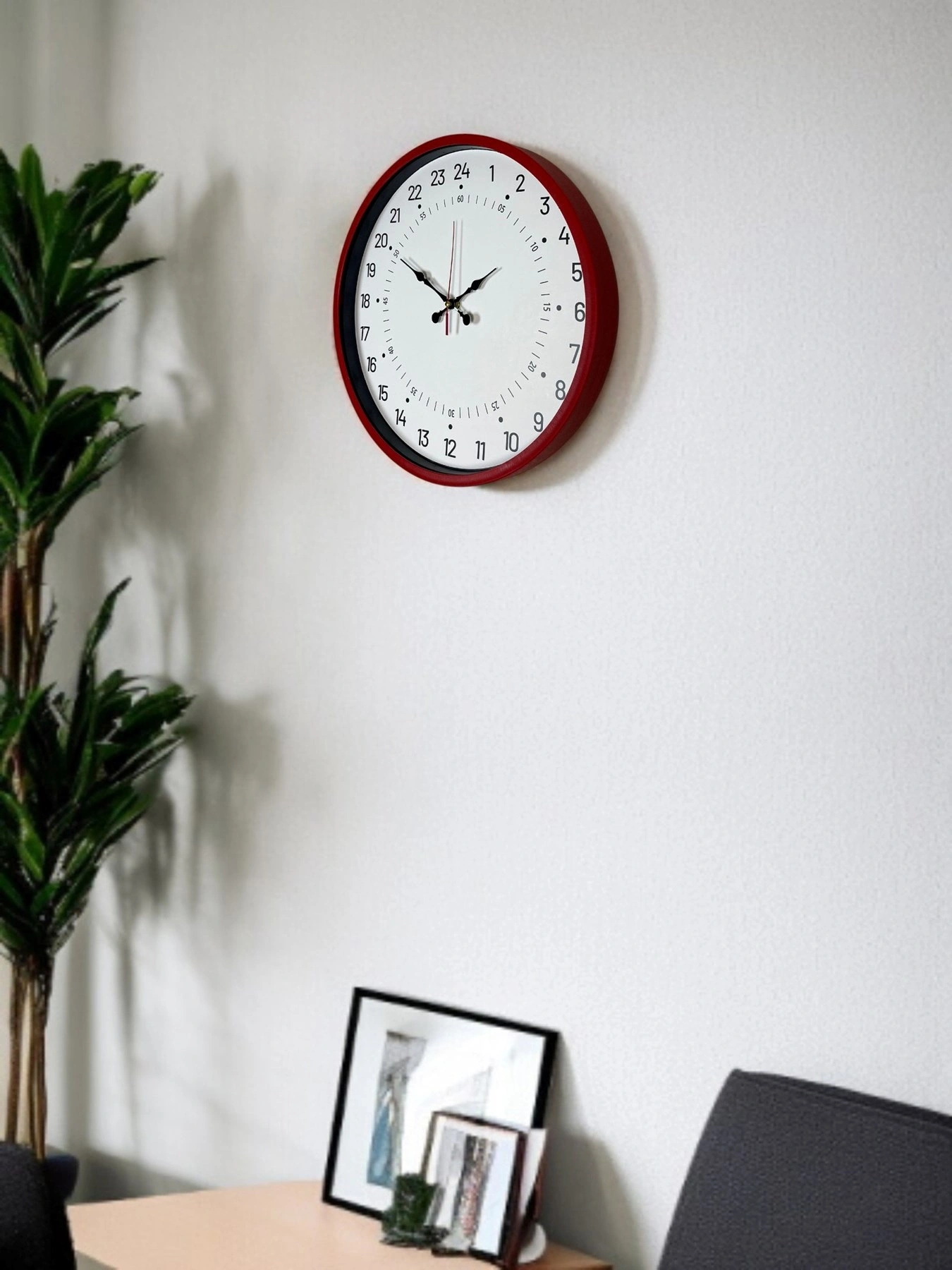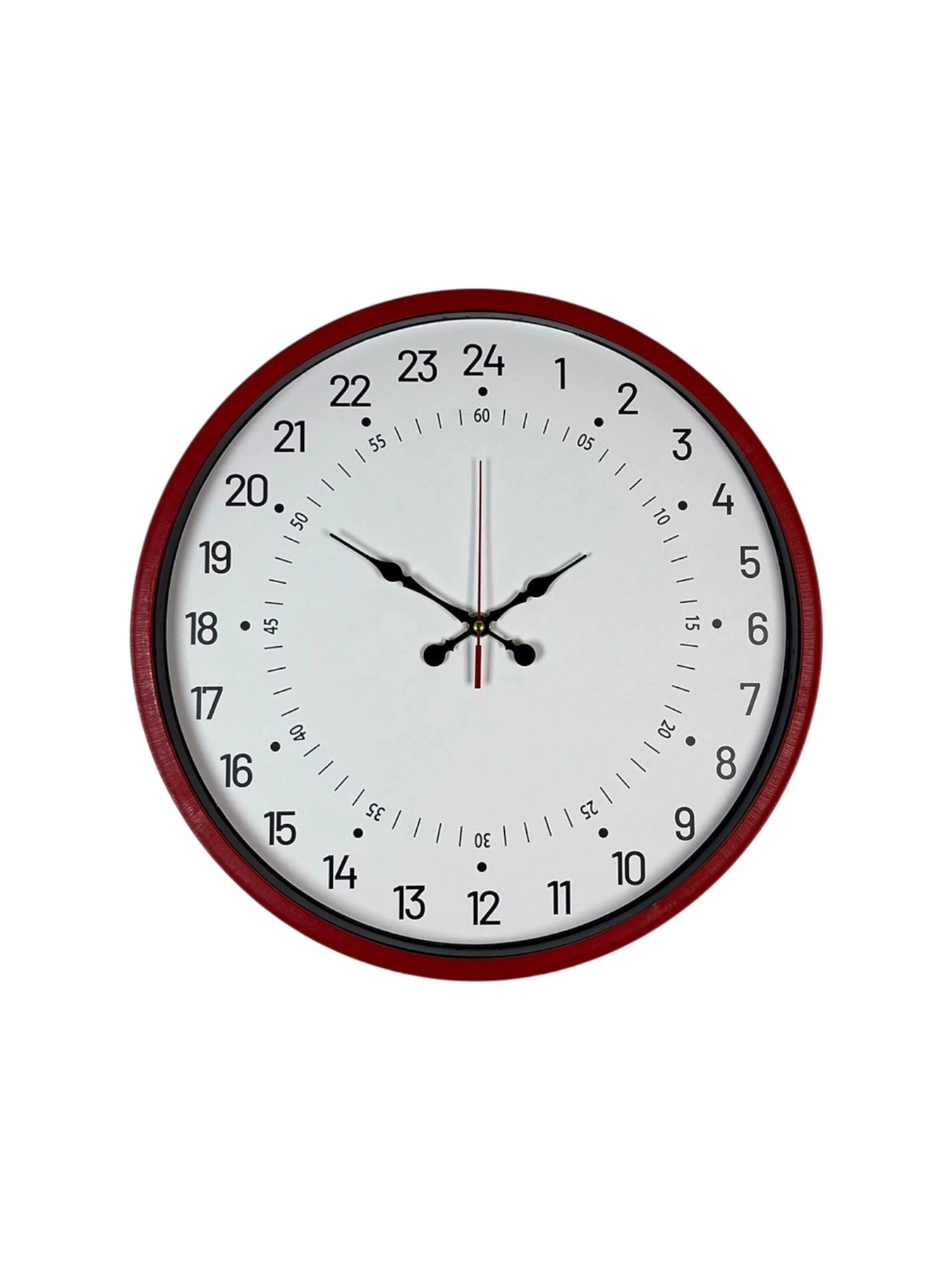 With its vibrant red frame and simple white dial, this 36 cm wall clock offers a modern and striking appearance that is immediately noticeable in any environment. The 24-hour display is ideal for those who enjoy unique designs, shift workers, offices, and educational spaces. This structure, which differentiates from standard clocks, makes the product both functional and original.